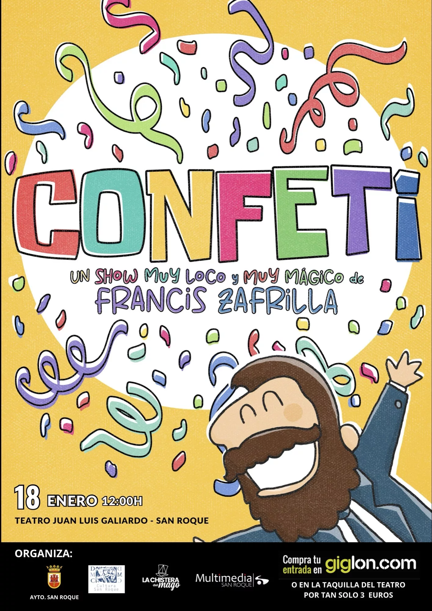 Francis Zafrilla es uno de los profesionales más destacados de nuestro país combinando ilusionismo, magia y títeres todos ellos aderezados con sus dotes de «showman». El show “Confeti” es una historia única y original que combina el maravilloso arte del ilusionismo, con el fantástico mundo de los títeres, en un mágico show musical con un poderoso mensaje: todo es posible con esfuerzo, humildad y pasión. Un espectáculo mágico con multitud de disciplinas fantásticas y tres objetivos por encima de todo: hacer disfrutar al público el máximo, lanzar toda la energía positiva posible y llenarlo todo de… confeti.