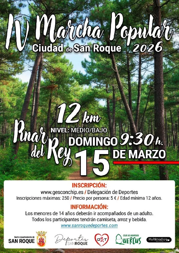 La IV Marcha Popular Ciudad de San Roque se desarrollará un año más en el Pinar del Rey, con salida prevista a las 9.30 horas del domingo 15 de marzo. La inscripción, a un precio de 5 euros, puede realizarse en la plataforma gesconchip.es (https://gesconchip.es/app/prueba/informacion/iv-marcha-popular-familiar-senderista-ciudad-san-roque-2026) o en las oficinas de la Delegación de Deportes (Camino del Almendral), habiéndose previsto un máximo de 250 plazas.