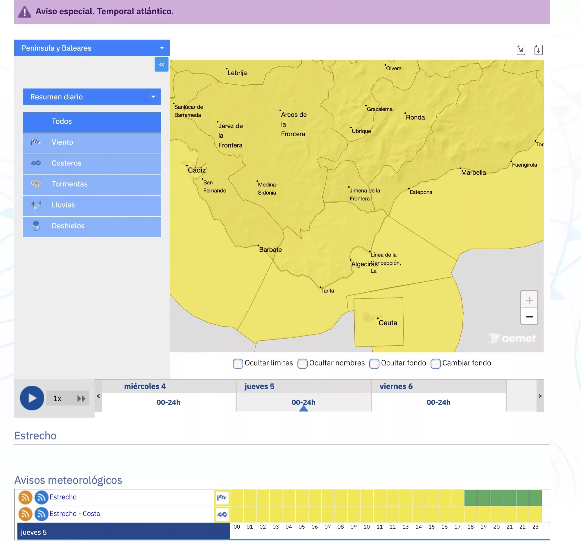 La Agencia Estatal de Meteorología (Aemet) ha dado aviso de nivel amarillo por viento en el Estrecho hasta las 18.00 horas del jueves, así como de nivel amarillo por fenómenos costeros hasta la medianoche de dicha jornada. Aunque no supone una vuelta a la normalidad, la mejoría de la situación climatológica ha llevado al Ayuntamiento a decidir la reapertura este jueves de la Casa Consistorial, de las alcaldías de barrio y del resto de las instalaciones municipales de atención al público, entre ellas los mercados de abastos. Asimismo, se volverá a poner en marcha el servicio de autobús urbano.
