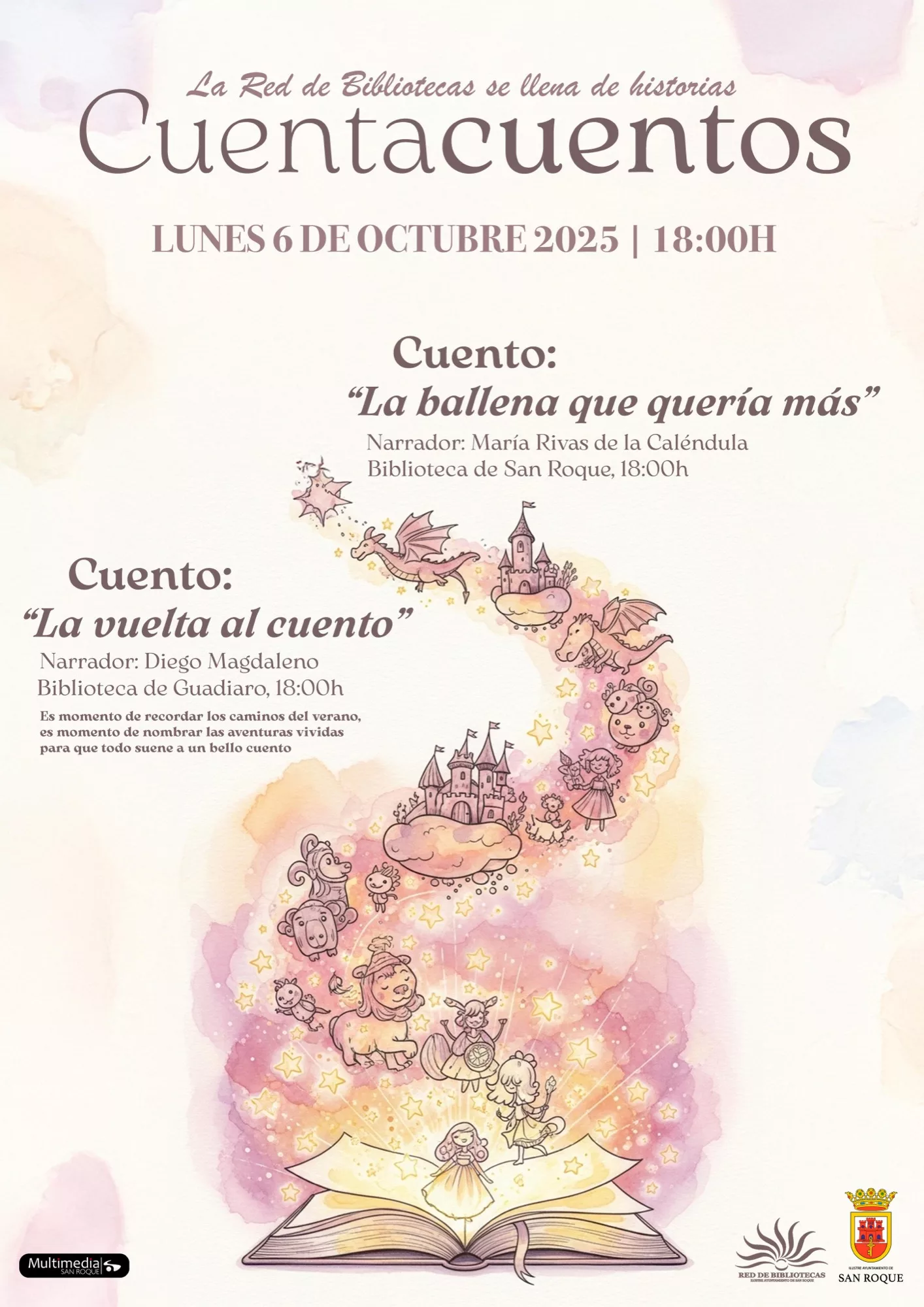 Este lunes 6 de octubre la Red de Bibliotecas de San Roque, que dirige la concejal Rocío Fernández, retoma las sesiones de cuentacuentos, una actividad que se desarrolla cada primer lunes de mes. María Rivas de la Caléndula contará a partir de las 6 de la tarde “La ballena que quería más”. Por su parte, Diego Magdaleno en la biblioteca de Guadiaro y también a partir de las 6 de la tarde narrará “La vuelta al cuento”, un recordatorio de las aventuras vividas en verano.