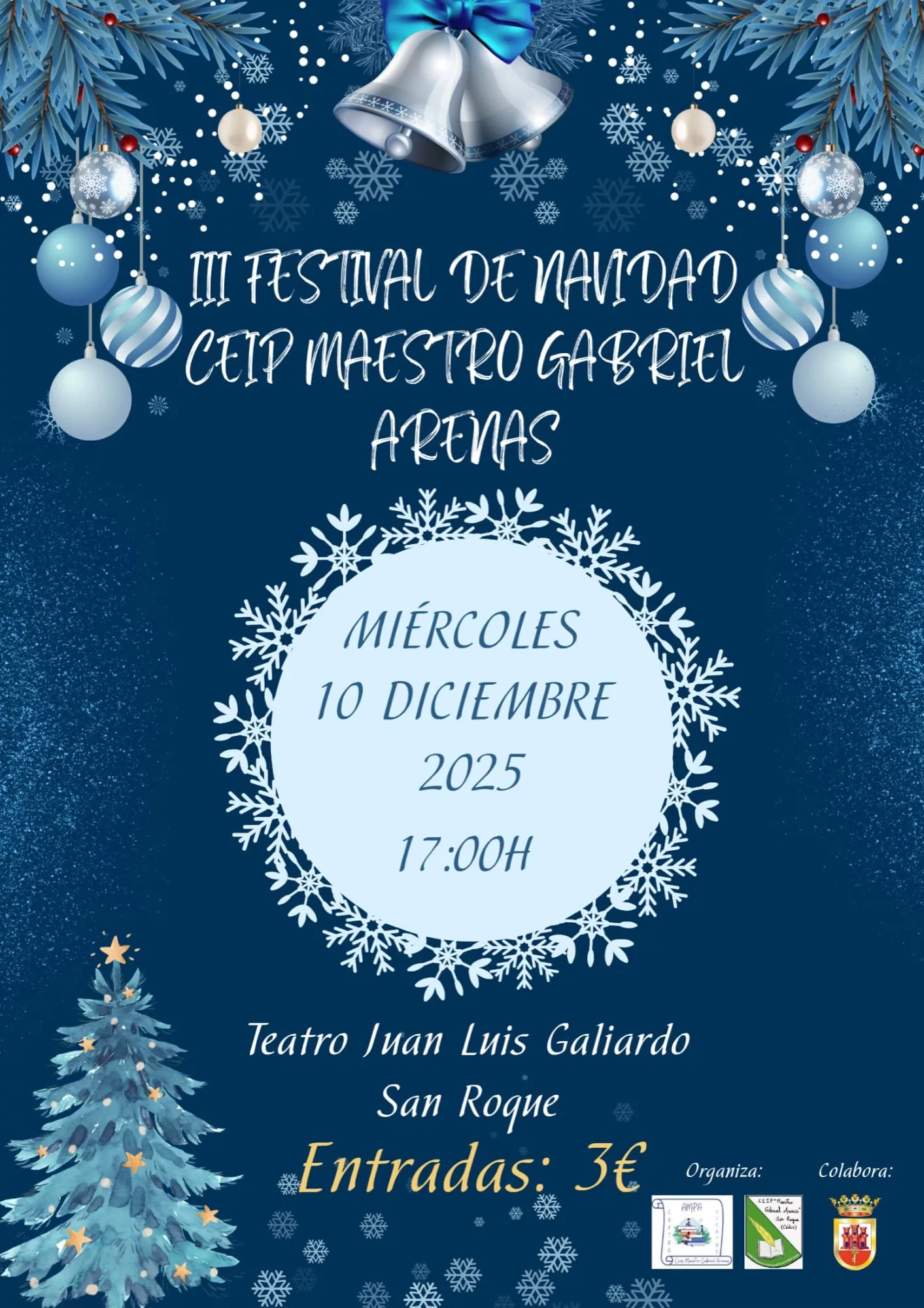 La Asociación de Madres y Padres de Alumnos “Cuatro Vientos” y el propio CEIP Maestro Gabriel Arenas organizan el III Festival de Navidad de dicho colegio, una serie de actuaciones a cargo del alumnado del centro que tendrán lugar el miércoles en el Teatro Juan Luis Galiardo a partir de las 17.00 horas. Colabora el Ayuntamiento de San Roque.