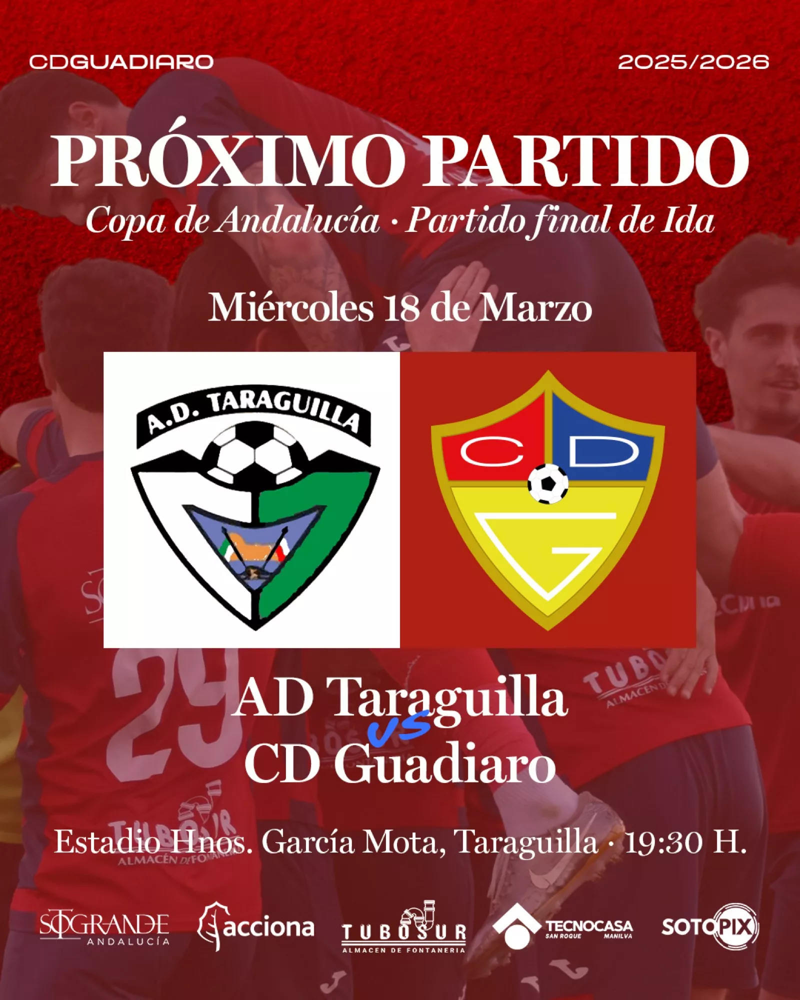 Agrupación Deportiva Taraguilla y Club Deportivo Guadiaro juegan en la tarde de este miércoles el partido de ida de la final de la Copa de Andalucía en Cádiz, encuentro que se disputará en el Hermanos García Mota a partir de las 19.30 horas.