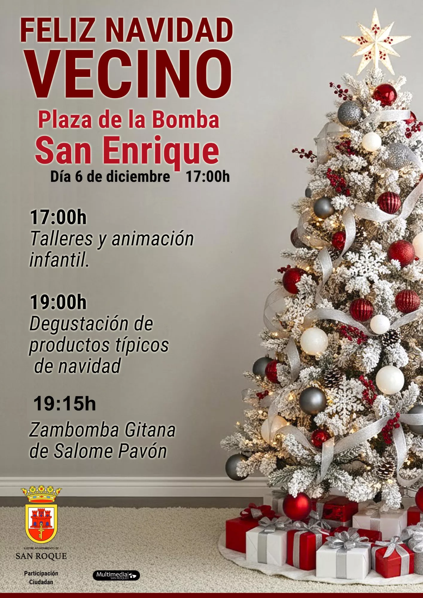 El próximo sábado 6 de diciembre, en la Plaza de la Bomba de San Enrique, se celebrará “Feliz Navidad, Vecino” con actividades de animación e hinchables para los pequeños de la barriada, degustación gastronómica y una zambomba flamenca como colofón a esta jornada de convivencia.