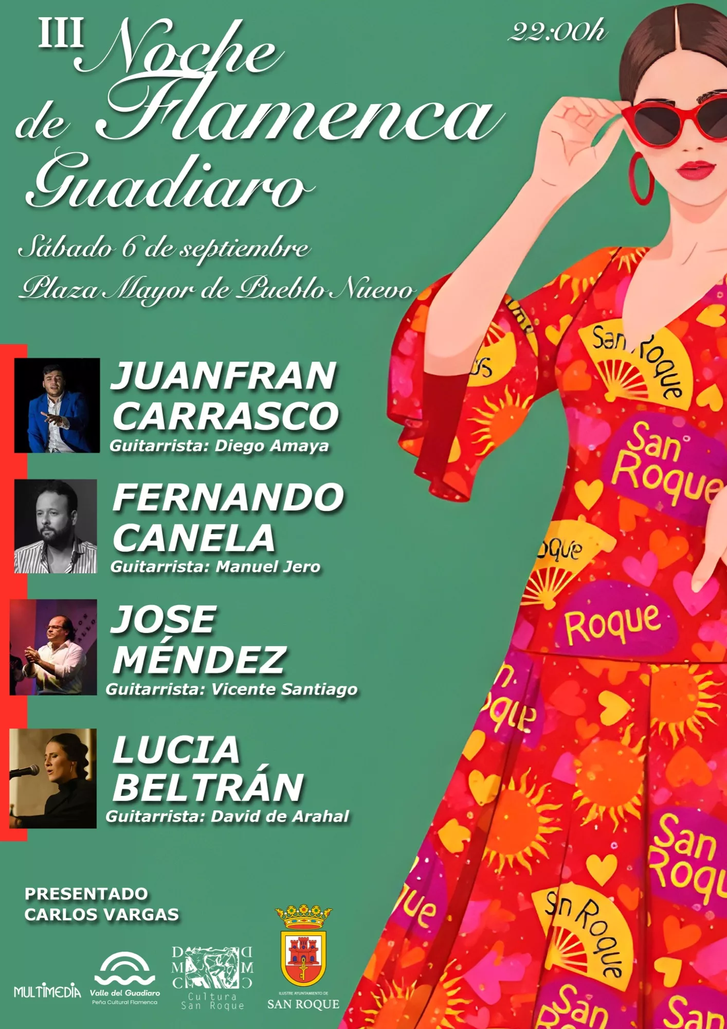 La III Noche Flamenca de Guadiaro dará comienzo el sábado 6 de septiembre a las 22.00 horas en la Plaza Mayor de Pueblo Nuevo. Es de entrada gratuita, y presentará el evento Carlos Vargas. Organiza la Asociación Cultural Flamenca de Guadiaro y la Delegación de Cultura del Ayuntamiento de San Roque, que dirige la teniente de alcalde Ana Ruiz.