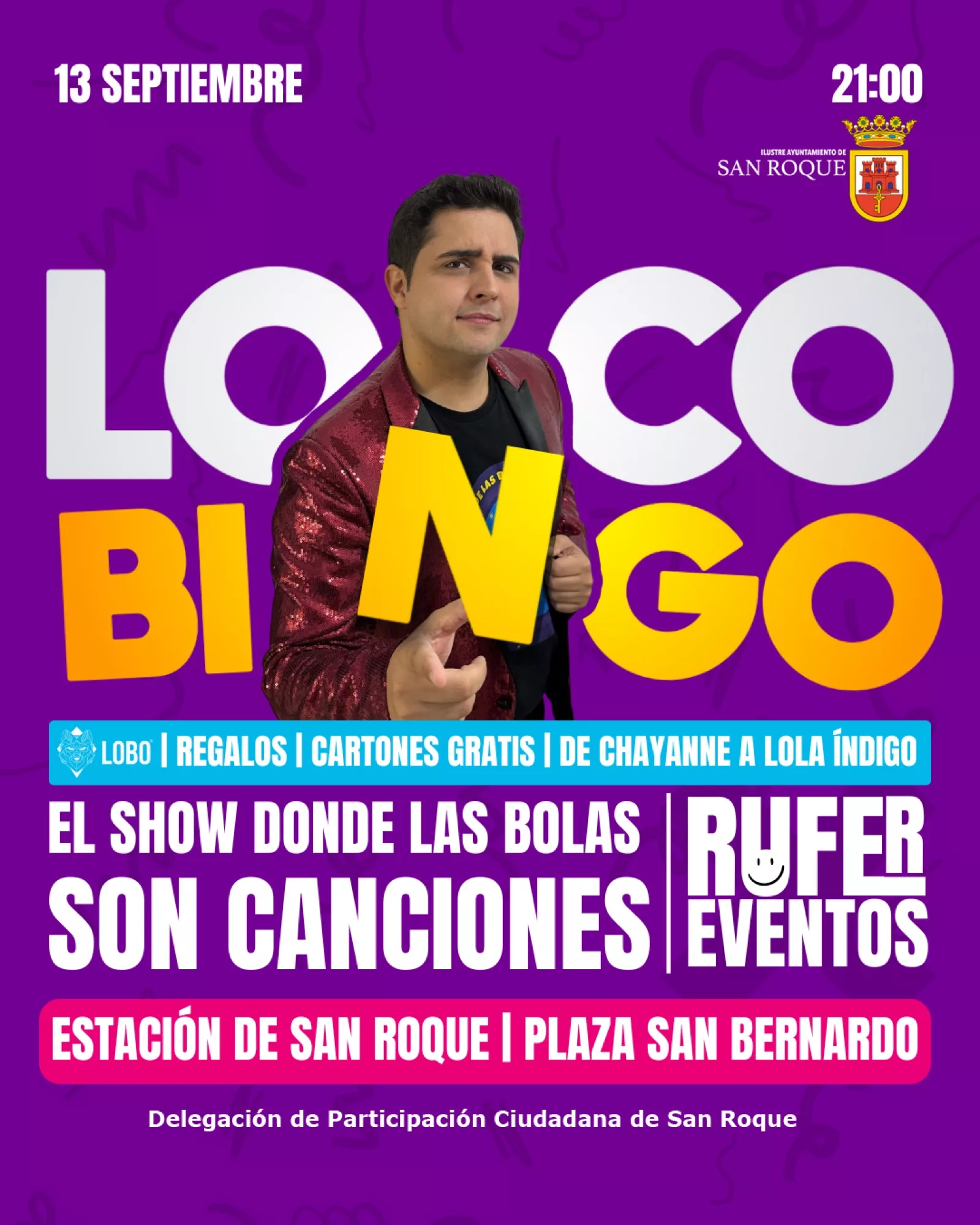 Este sábado, 13 de septiembre, el show “Loco Bingo” tendrá lugar en la Plaza San Bernardo, Estación, a las 21.00 horas. Esta actividad combina diversión, música y participación, y que está promovida por la Delegación de Participación Ciudadana, que dirige la edil Rocío Fernández.
