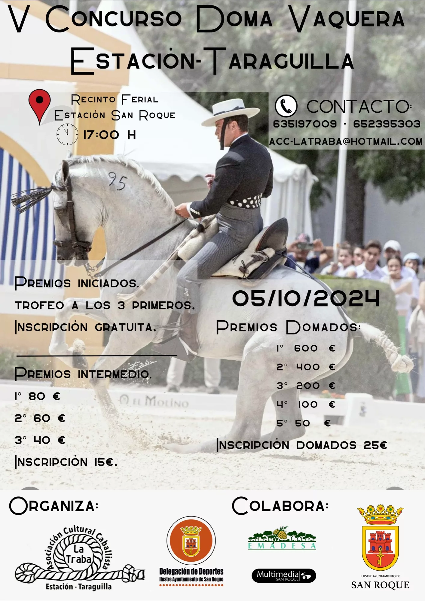El V Concurso de Doma Vaquera Estación-Taraguilla cuenta con la organización de la Asociación Cultural Caballista La Traba, con la colaboración de distintos departamentos del Ayuntamiento de San Roque, como la Delegación de Deportes, la Tenencia de Alcaldía de Estación, Taraguilla y Miraflores, la Delegación de Participación Ciudadana y las empresas municipales Emadesa y Multimedia. Para más información se puede llamar a los teléfonos de contacto 635 197 009 y 652 395 303, o enviar un correo electrónico a acc-latraba@hotmail.com.