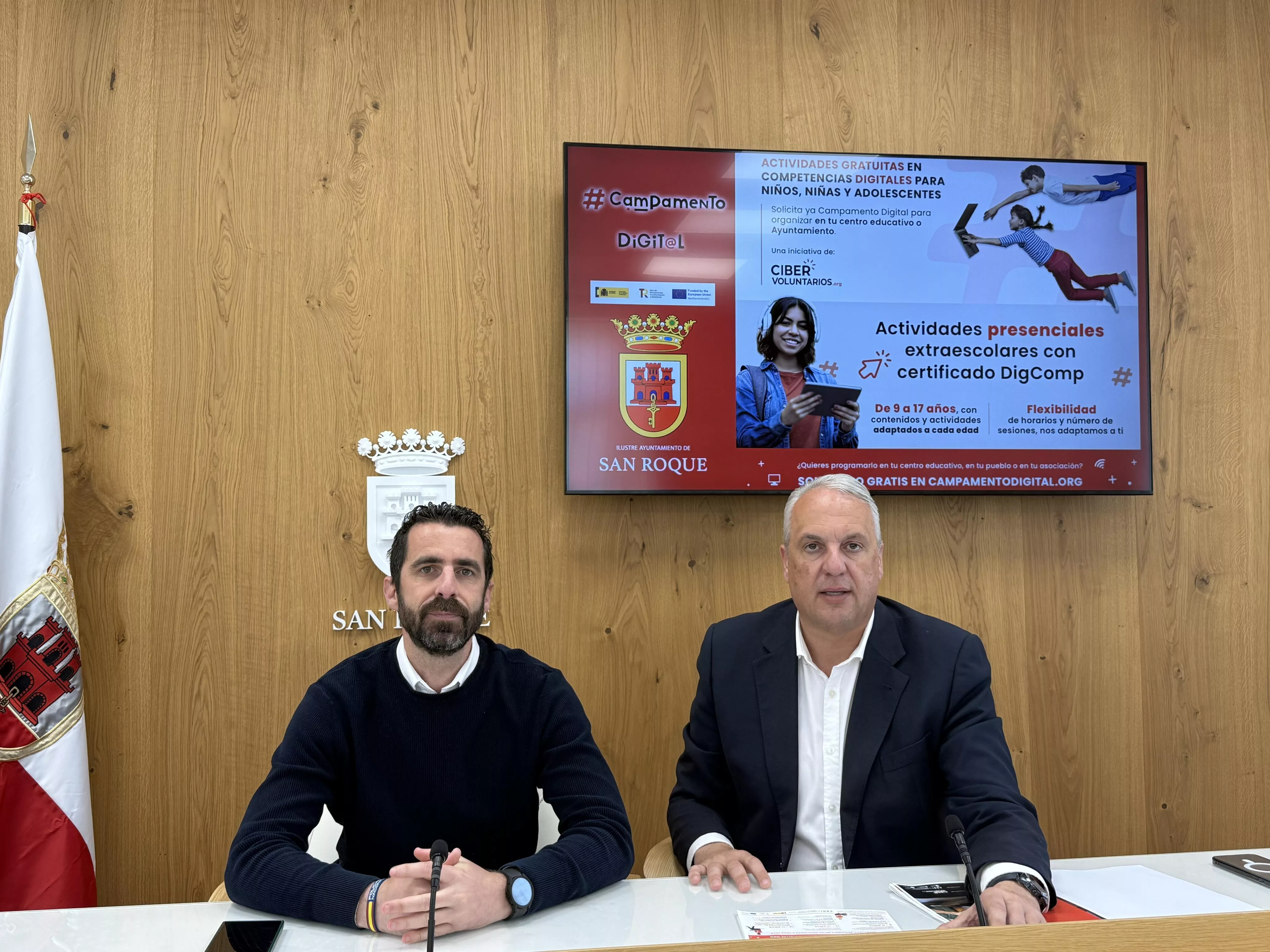 El alcalde de San Roque, Juan Carlos Ruiz Boix, presentó junto al teniente de alcalde de Juventud, David Ramos, los Campamentos Digitales, que se van a desarrollar en julio y agosto en el municipio.