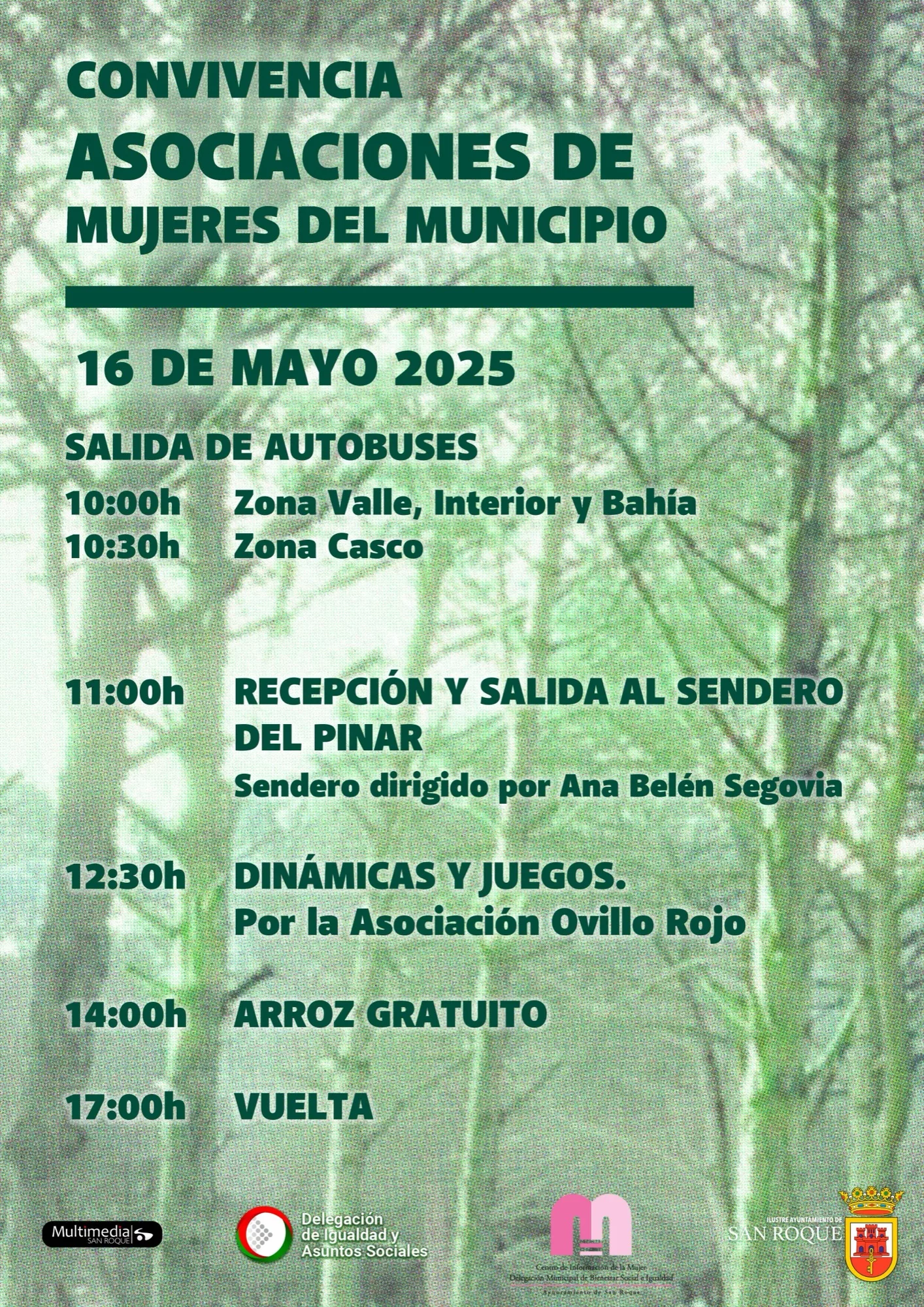 Autobuses recogerán, a las 10 de la mañana, a las mujeres de la zona interior, Valle del Guadiaro y la Bahía, mientras que a las 10:30 se realizará la recogida en el casco de San Roque, para llegar juntas sobre las 11 al Pinar del Rey.