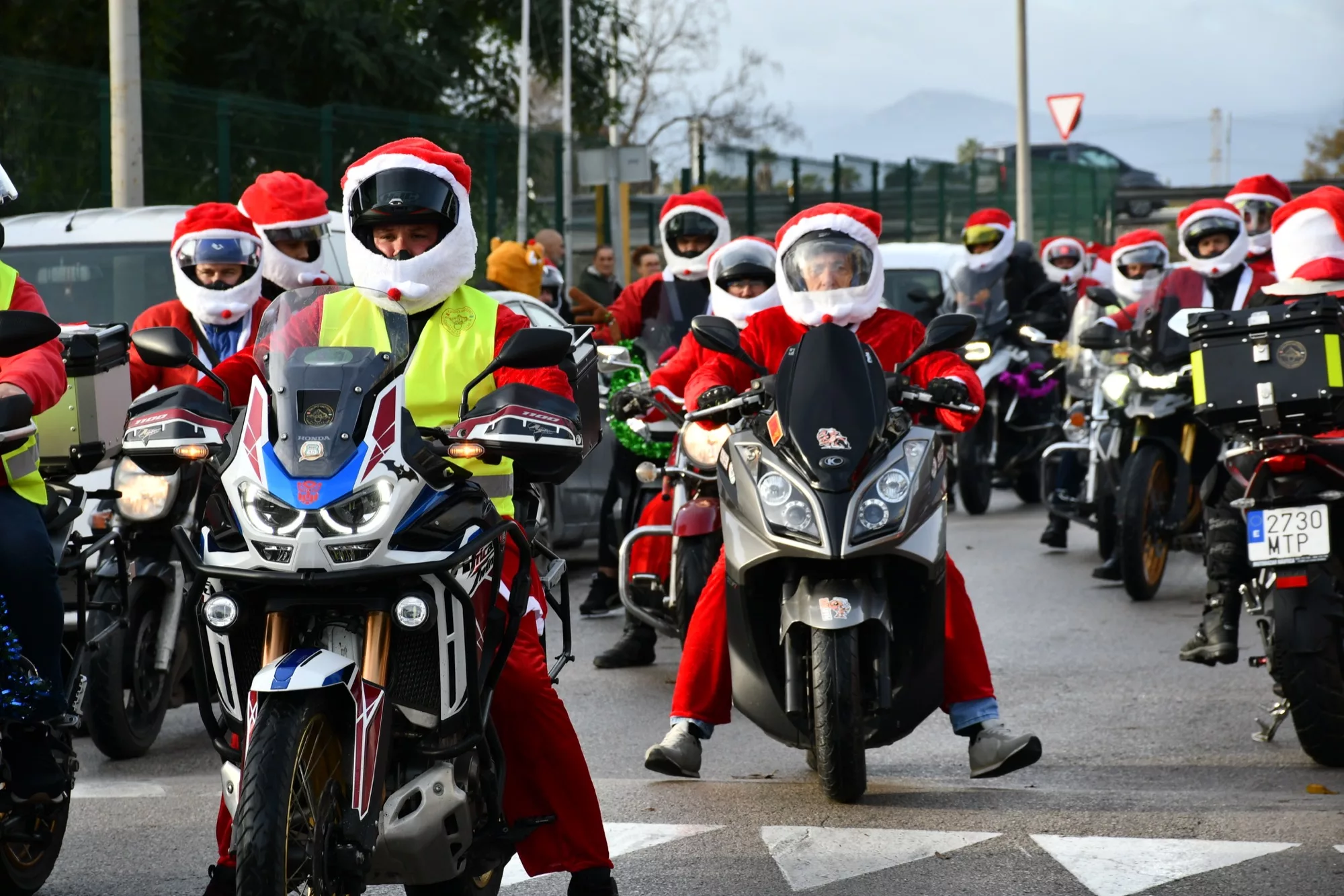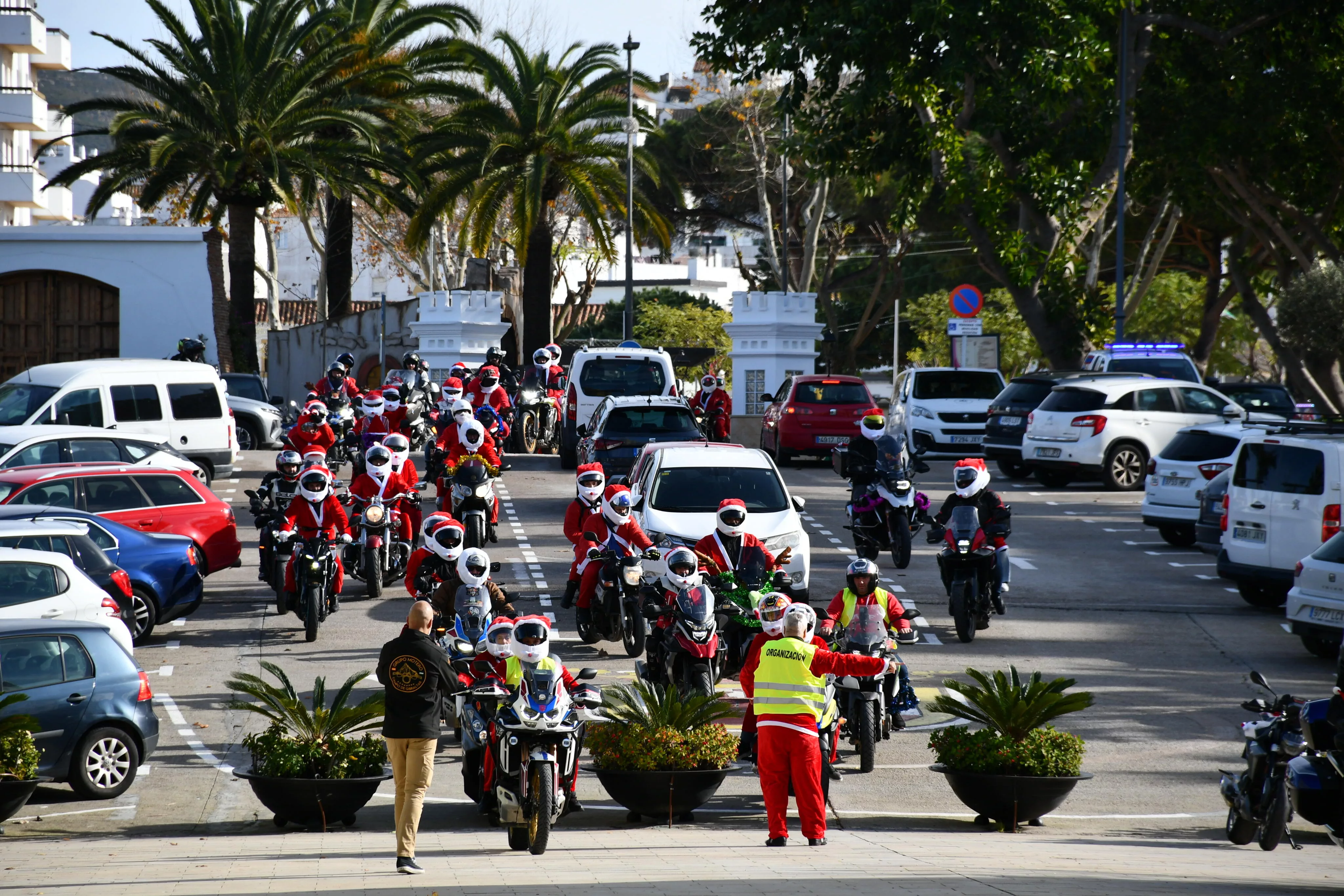 Cerca de un centenar de motoristas, ataviados como Papa Noel, han recorrido el municipio de San Roque en favor de la campaña de recogida de juguetes que cada año lleva a cabo Apoyo Mutuo. La denominada “Papanoelada” ha estado organizada por el Grupo Motero Campo de Gibraltar y ha contado con la colaboración de la delegación de Deportes, que dirige el teniente alcalde, Fernando Vega.