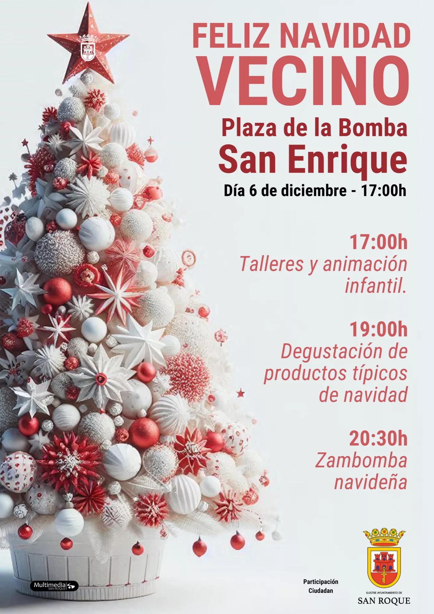La Delegación de Participación Ciudadana y la comisión de fiestas de San Enrique, con la colaboración de la Asociación de Mujeres Plaza de La Bomba, pone en marcha la segunda edición de “Feliz Navidad, Vecino”, una actividad que tendrá lugar el viernes 6 de diciembre por la tarde en dicha barriada. Además de talleres y animación infantil, habrá degustación de productos navideños y, como colofón, la actuación de una zambomba flamenca.