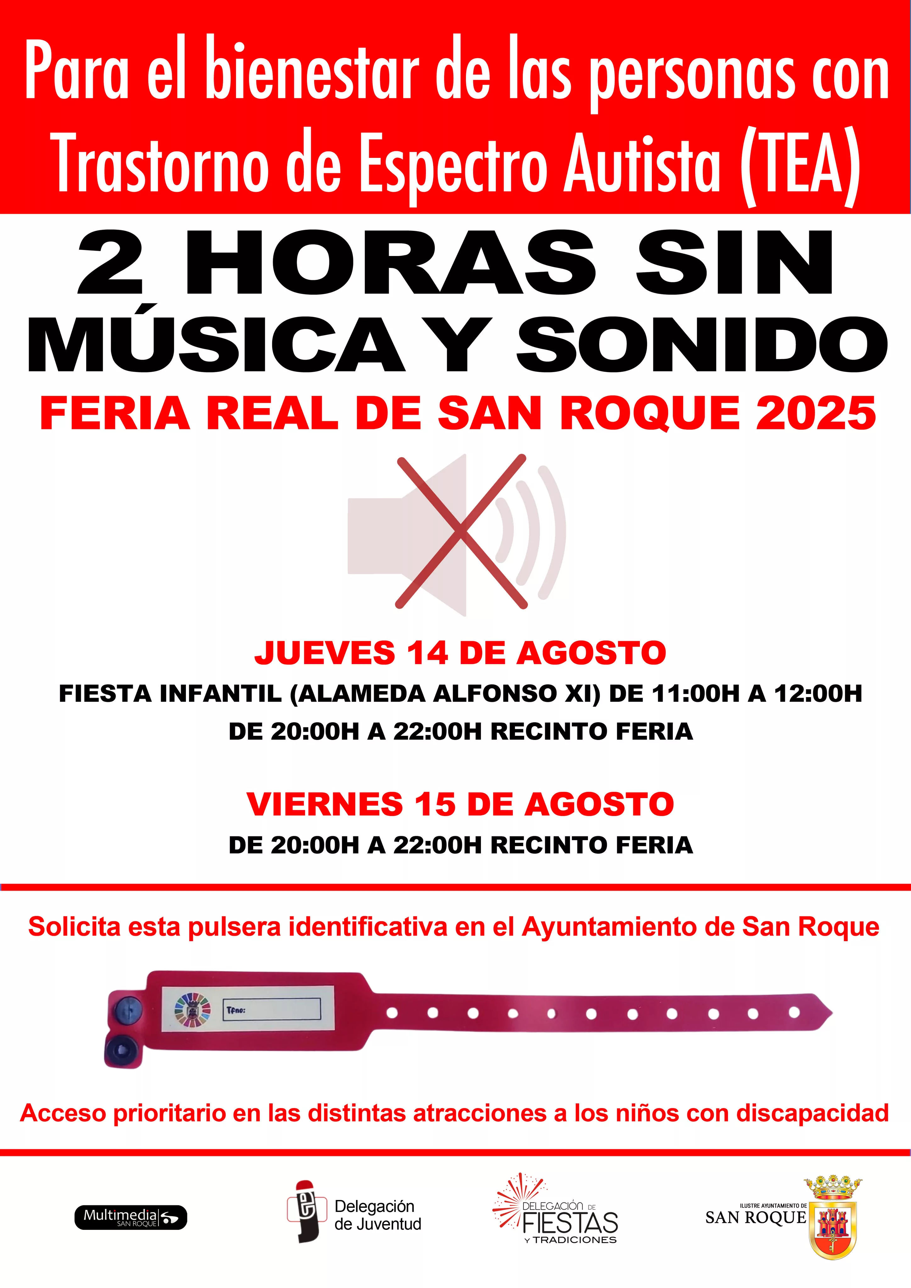 El Ayuntamiento de San Roque distribuirá pulseras identificativas para dar prioridad a los niños con discapacidad a la hora de montar en las atracciones de la Feria Real. Además, y como ha ocurrido en el resto de las ferias del verano en el municipio, habrá horas sin música ni sonido pensando en las personas con Trastorno del Espectro Autista (TEA).