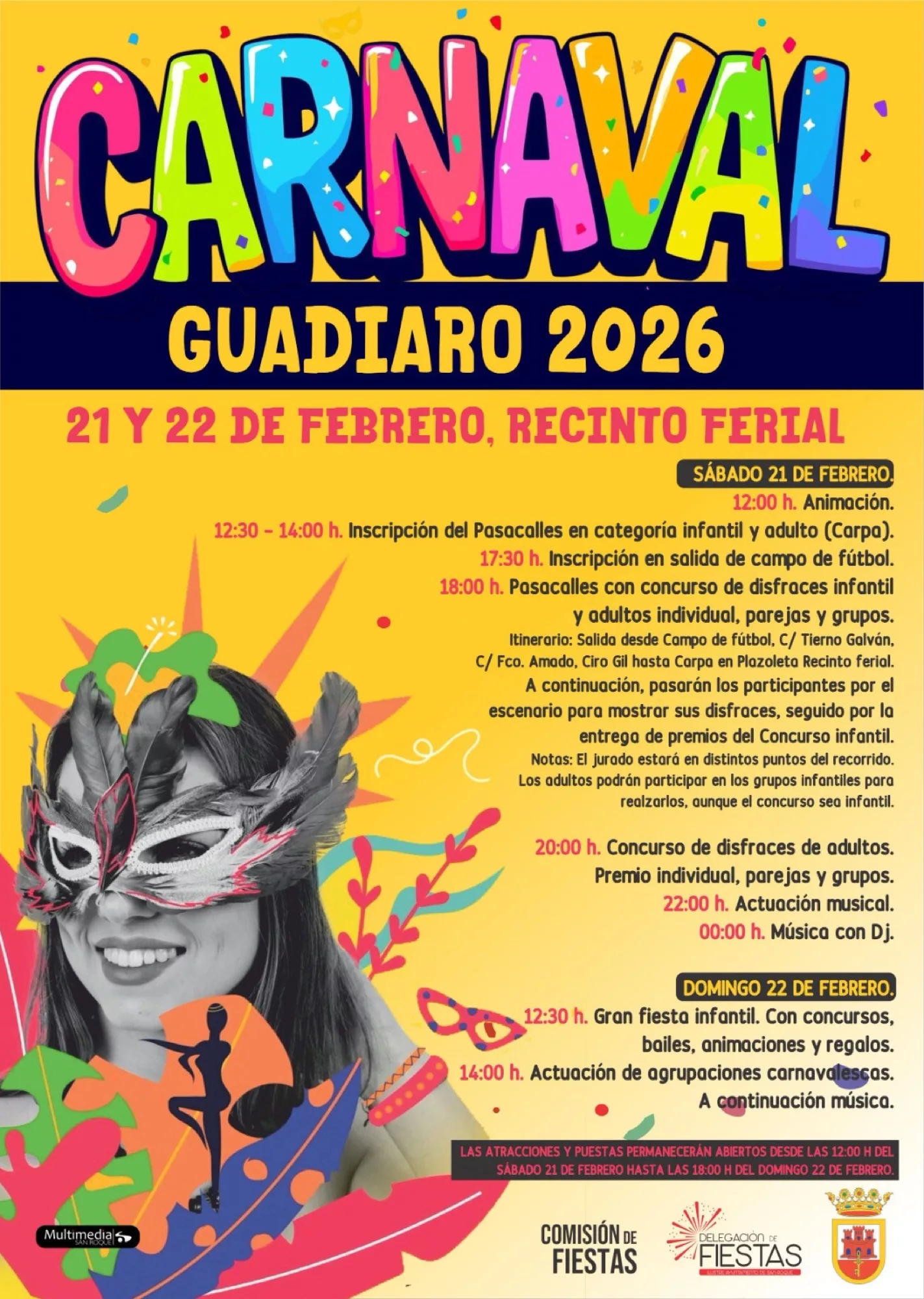 En cuanto al Carnaval de Guadiaro 2026, se desarrollará el sábado y el domingo y tendrá su epicentro en la carpa montada en el recinto ferial de la barriada, donde habrá atracciones para los más pequeños desde el mediodía del sábado hasta las 18.00 horas del domingo. La primera actividad será el sábado a las 12.00 horas, con un espectáculo de animación, además de que se abrirá la inscripción al pasacalles de por la tarde, tanto en categoría infantil como en adultos, si bien también podrá hacerse a las 17.30 en la zona de salida, en el Campo de Fútbol “La Unión”.