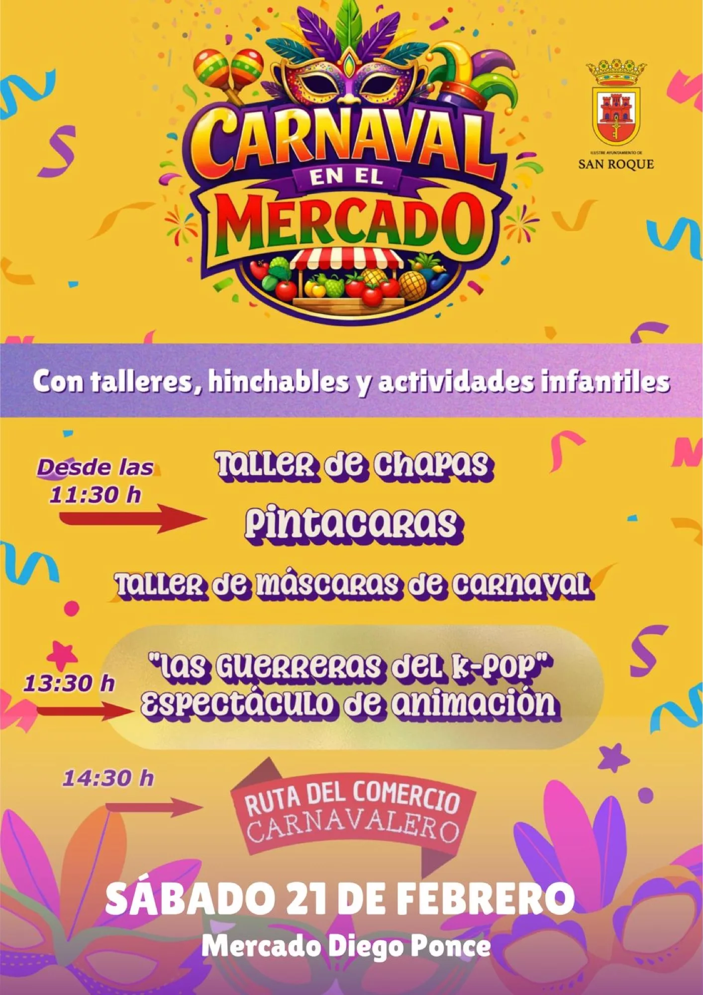 En cuanto a la jornada del sábado en San Roque Ciudad, la primera actividad programada es el Carnaval en el Mercado Diego Ponce, organizado por la Delegación de Comercio y dirigido al público infantil. A partir de las 11.30 horas habrá talleres de chapas y de máscaras de carnaval, así como pintacaras. A las 13.30 horas se desarrollará el espectáculo de animación “Las guerreras del K-Pop”.