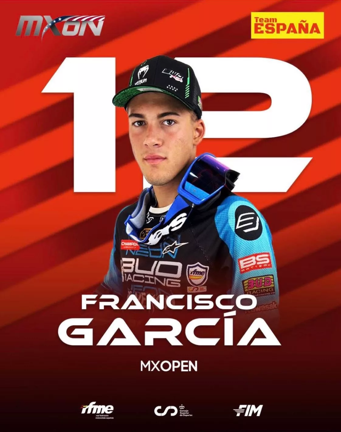 En cuanto a su participación en el Motocross de las Naciones, acompañará al capitán del equipo, Rubén Fernández y a Guillem Farrés. Francisco García debutará en la categoría Open, cubriendo la baja del piloto previsto inicialmente, Jorge Prado.