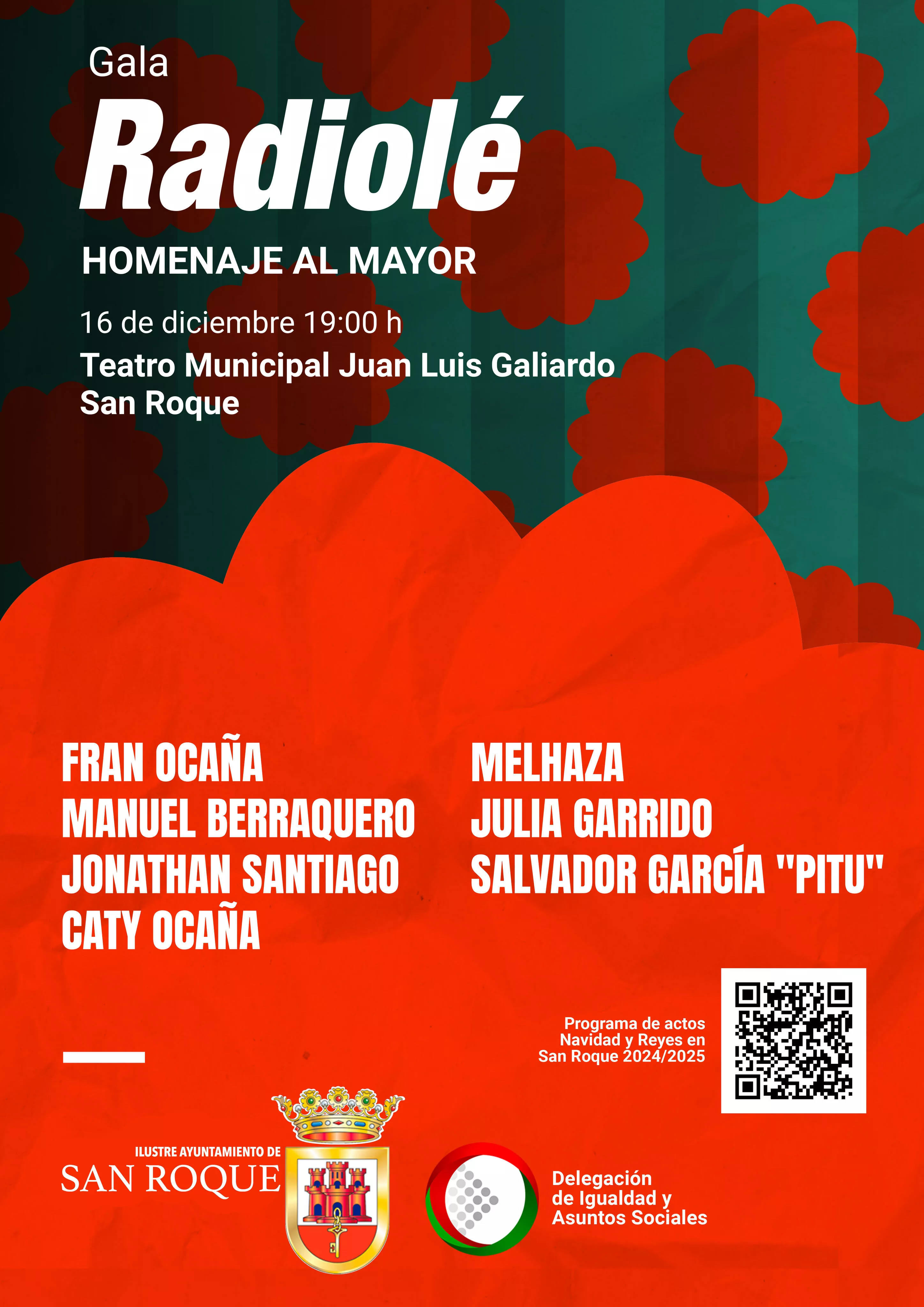 Por tercer año consecutivo, el Teatro Juan Luis Galiardo acogerá la Gala Radiolé en Homenaje al Mayor, que se celebrará el lunes 16 de diciembre a las 19.00 horas. Se contará con las actuaciones de Fran Ocaña, Manuel Berraquero, Jonathan Santiago, Caty Ocaña, el trío Melhaza, Julia Garrido y Salvador García “Pitu”.