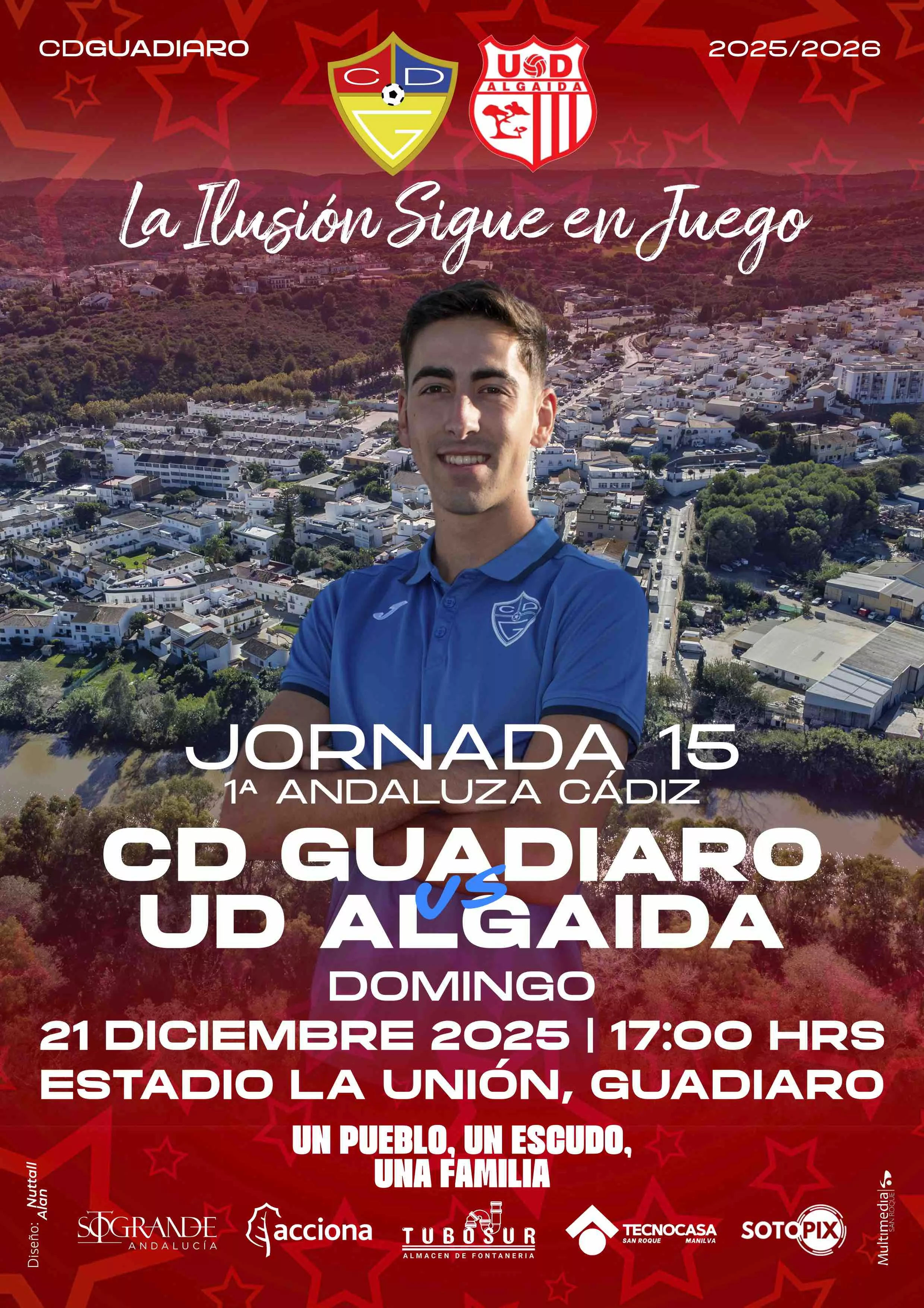 El próximo domingo 21 de diciembre se llevará a cabo la décimo quinta y última jornada de Liga correspondiente a la primera vuelta en Primera Andaluza Cádiz. La Unión Deportiva Algaida y el Club Deportivo Guadiaro se enfrentarán en el estadio La Unión de Guadiaro, a las 17:00 horas.