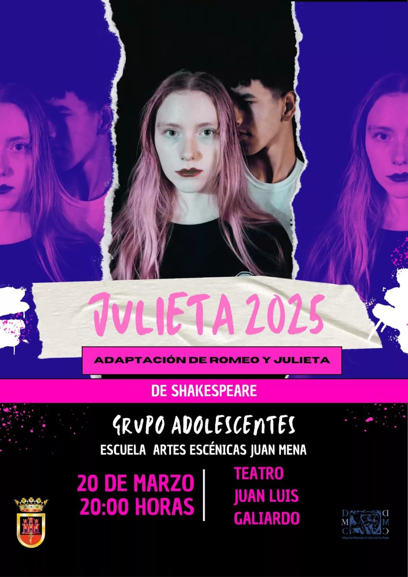 Hoy jueves 20 de marzo a las 20.00 horas, en el Teatro Juan Luis Galiardo, será el turno de los 20 integrantes del grupo adolescente de la escuela sanroqueña (de 13 a 17 años). Si el año pasado triunfó con su espectáculo “Las 13 Rosas”, esta vez ofrece la obra “Julieta 2025”, una adaptación moderna y audaz de la clásica tragedia de Shakespeare, “Romeo y Julieta”, ambientada en un instituto contemporáneo. La pieza explora temas como el amor adolescente, la presión social, las diferencias de clase y los peligros de ser adolescente, a través de personajes arquetípicos y situaciones reconocibles para el público joven.