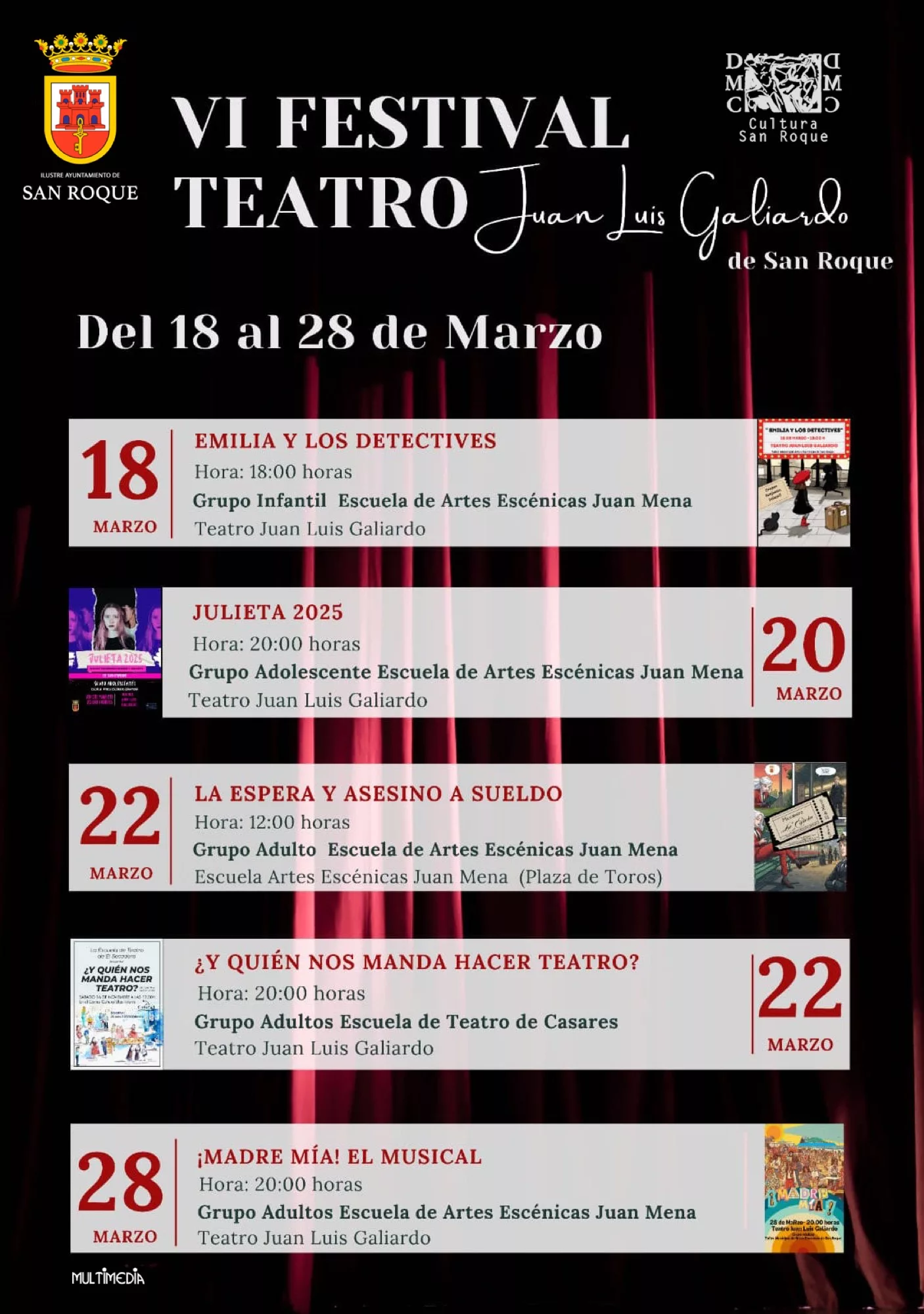 La Delegación de Cultura del Ayuntamiento de San Roque organiza el VI Festival de Teatro Juan Luis Galiardo, que incluye un total de cinco obras a cargo de artistas aficionados en el mismo Teatro Juan Luis Galiardo y en la sede de la Escuela de Teatro Juan Mena.
