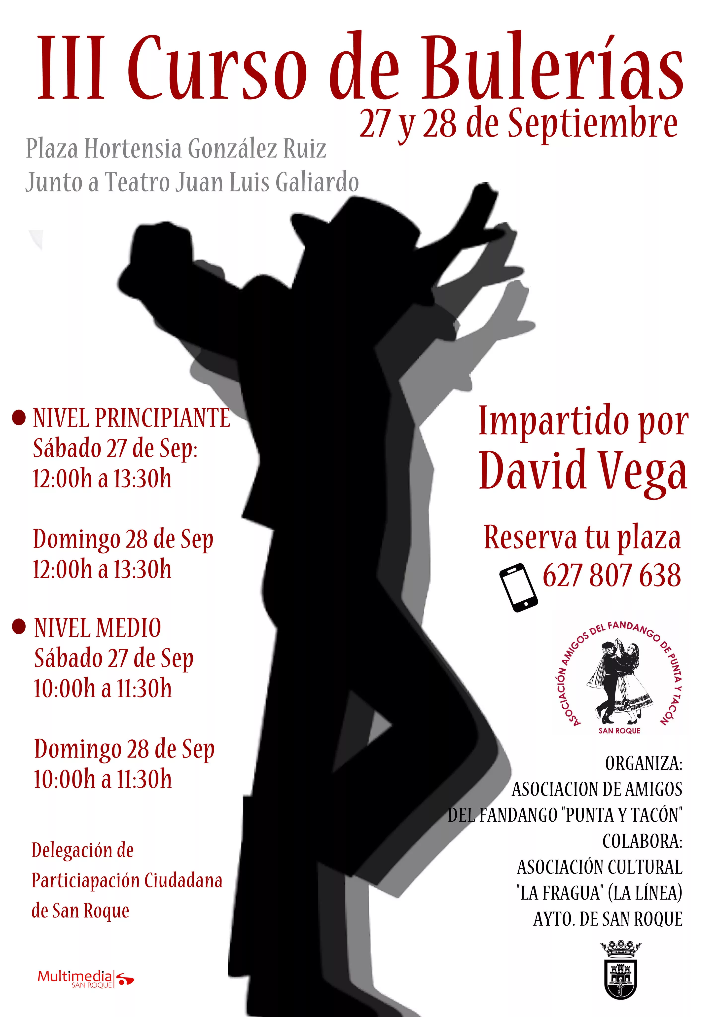 La Asociación Amigos del Fandango «Punta y Tacón» y la Asociación Cultural La Fragua de La Línea organizan junto al Ayuntamiento de San Roque, una tercera edición de Curso Intensivo de Bulerías de Jerez, también para niveles de principiantes y medio.