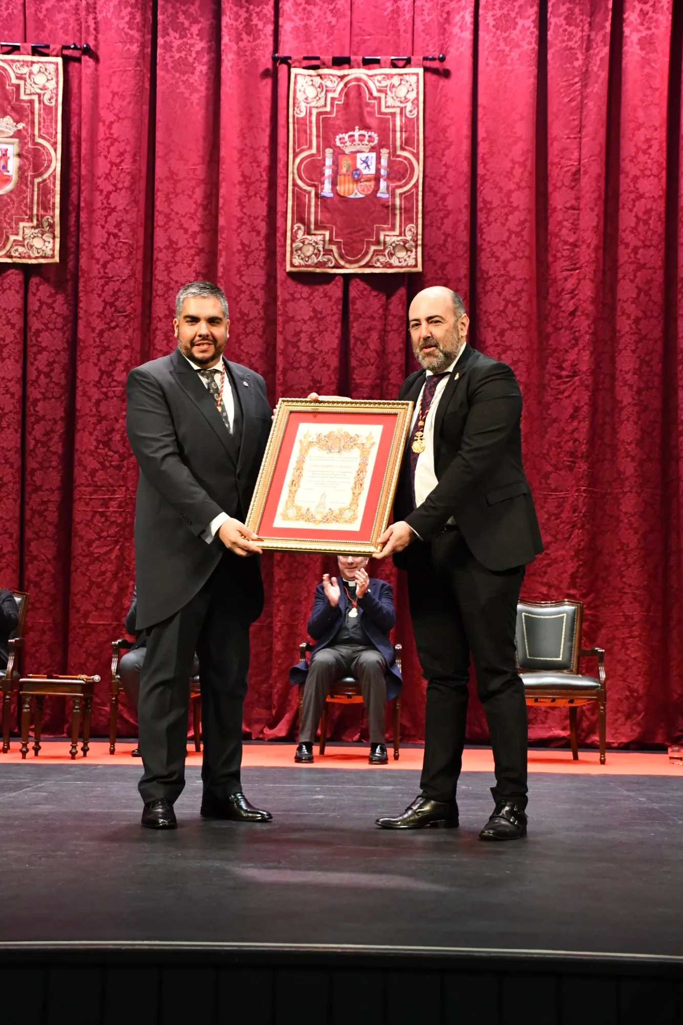 Al finalizar el pregón, y tras un prolongado aplauso de los presentes, Juan Angulo recibió un obsequio del Consejo Local de Hermandades y Cofradías, de manos de su presidente, José Luis Perales. Hay que señalar que las palabras de Angulo tuvieron el acompañamiento musical de la Banda Sinfónica Amando Herrero de Algeciras, que interpretó las marchas procesionales “Amarguras”, “Jesús de las Penas” y “Madre Inhiesta”, así como la “Marcha Real”, el himno de España con el que se puso punto y final al pregón.
