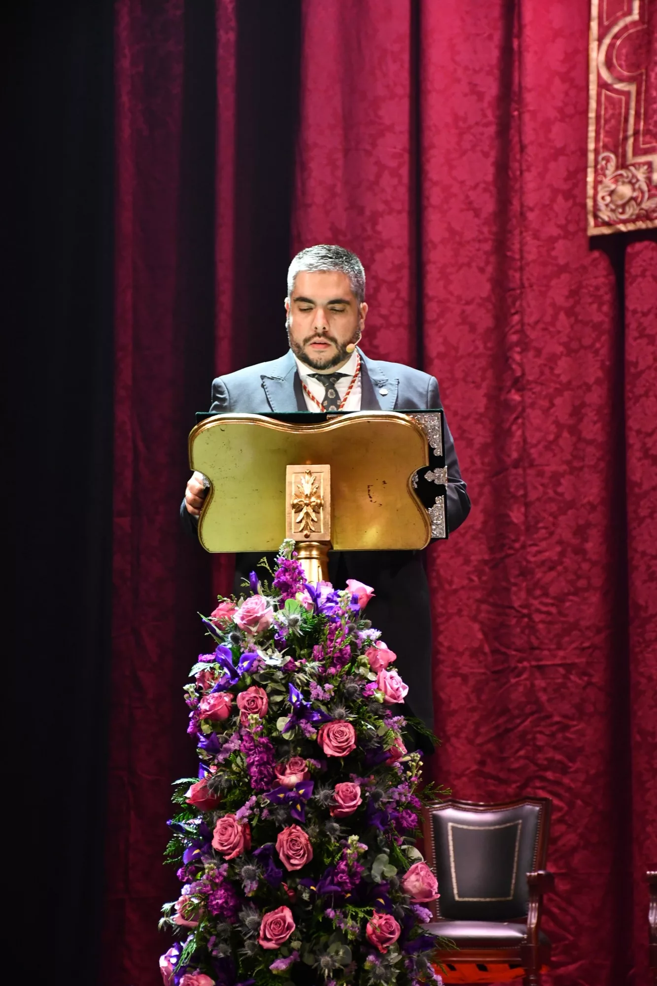 Juan Angulo también hizo un recorrido por las distintas procesiones que componen la Semana Santa sanroqueña, y tuvo palabras de recuerdo para personas como Adrián Gómez de Prado, capataz de la Oración en el Huerto, fallecido el año pasado. El pregonero, que forma parte de la Hermandad del Calvario, no ocultó su devoción por María Santísima de las Penas, una de las imágenes que integran el paso de misterio de dicha hermandad.