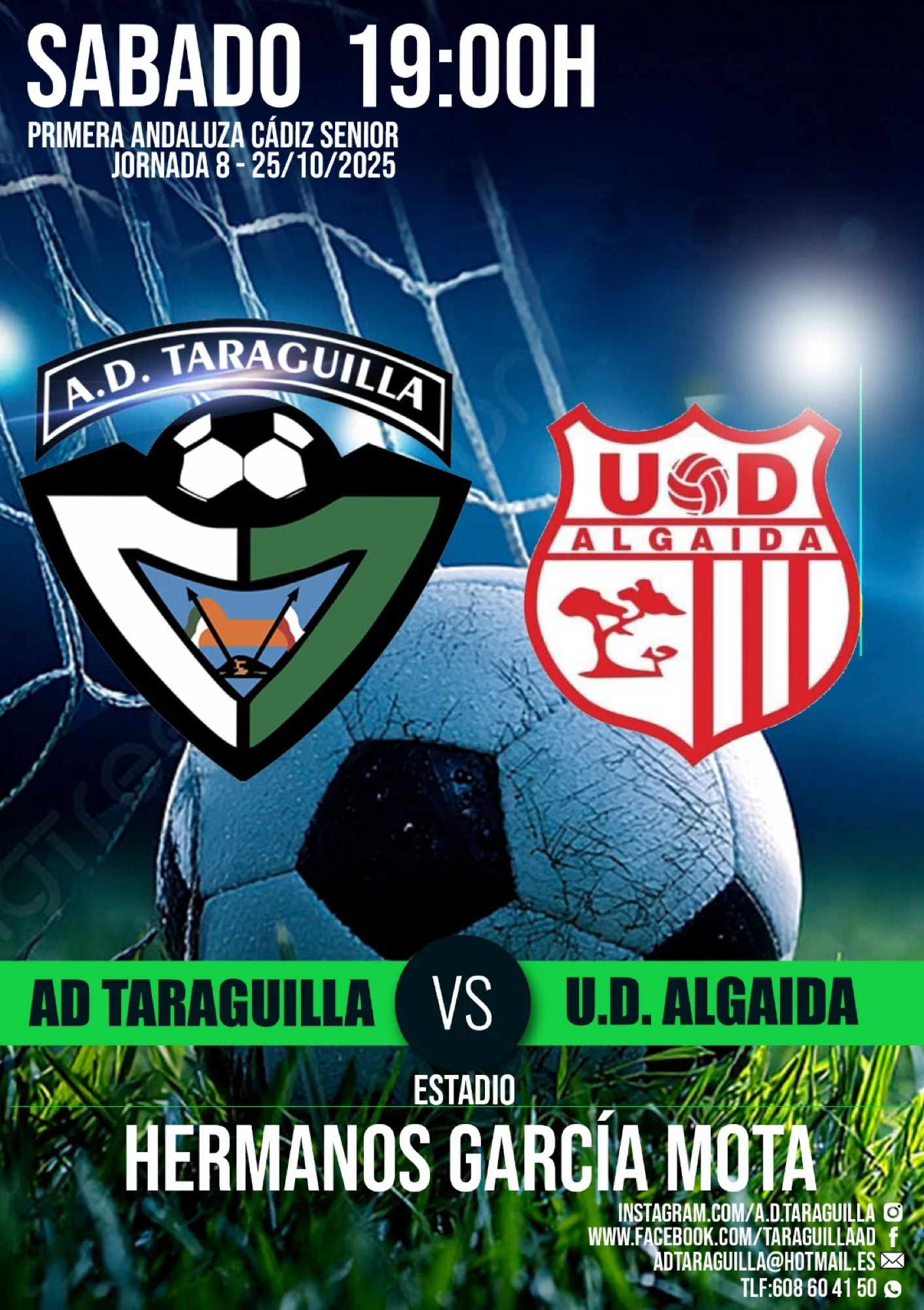 El Municipal Hermanos García Mota albergará este sábado, a partir de las 19.00 horas, el partido entre la AD Taraguilla y el Algaida UD, encuentro correspondiente a la jornada octava de Primera Andaluza Cádiz. Arbitrará el colegiado David Araujo.