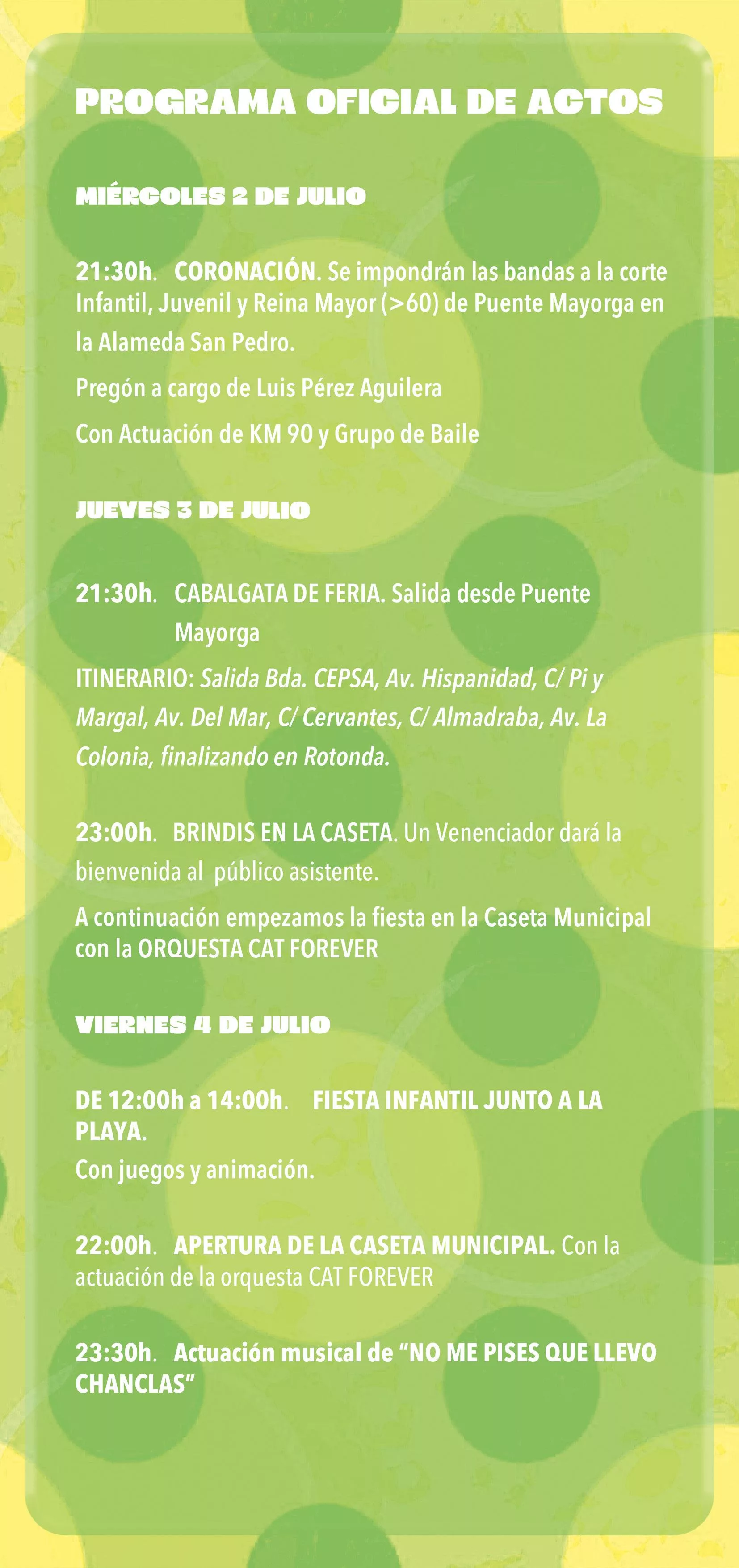 El jueves 3 de julio tendrán lugar las Cabalgatas de la Feria, que saldrán simultáneamente a las 21:30 horas de Puente Mayorga y Campamento respectivamente, para concluir conjuntamente en el Recinto Ferial, donde se procederá al brindis que dará paso a la apertura de la Caseta, dando la bienvenida al publico asistente, y a continuación empezará la fiesta en la Caseta Municipal con actuación de la mano de la Orquesta Cat Forever.