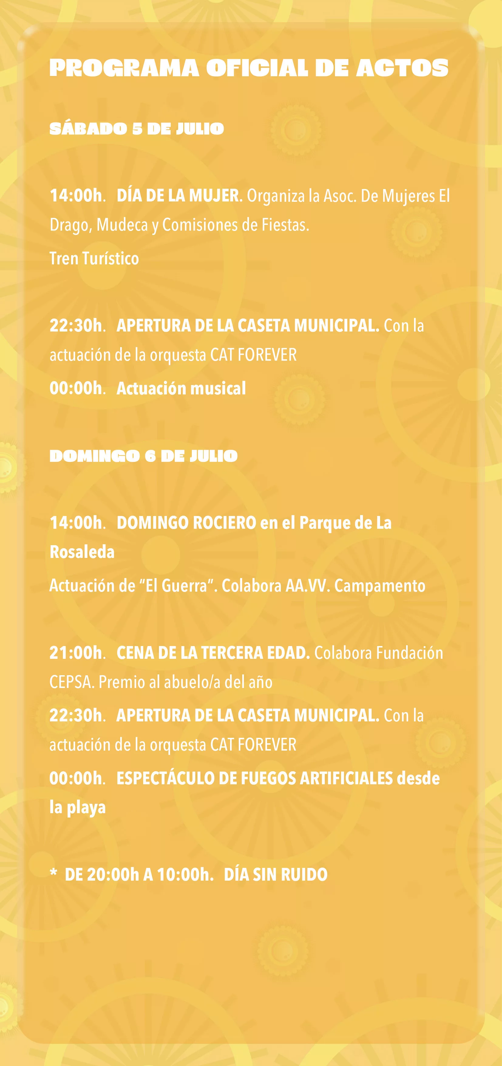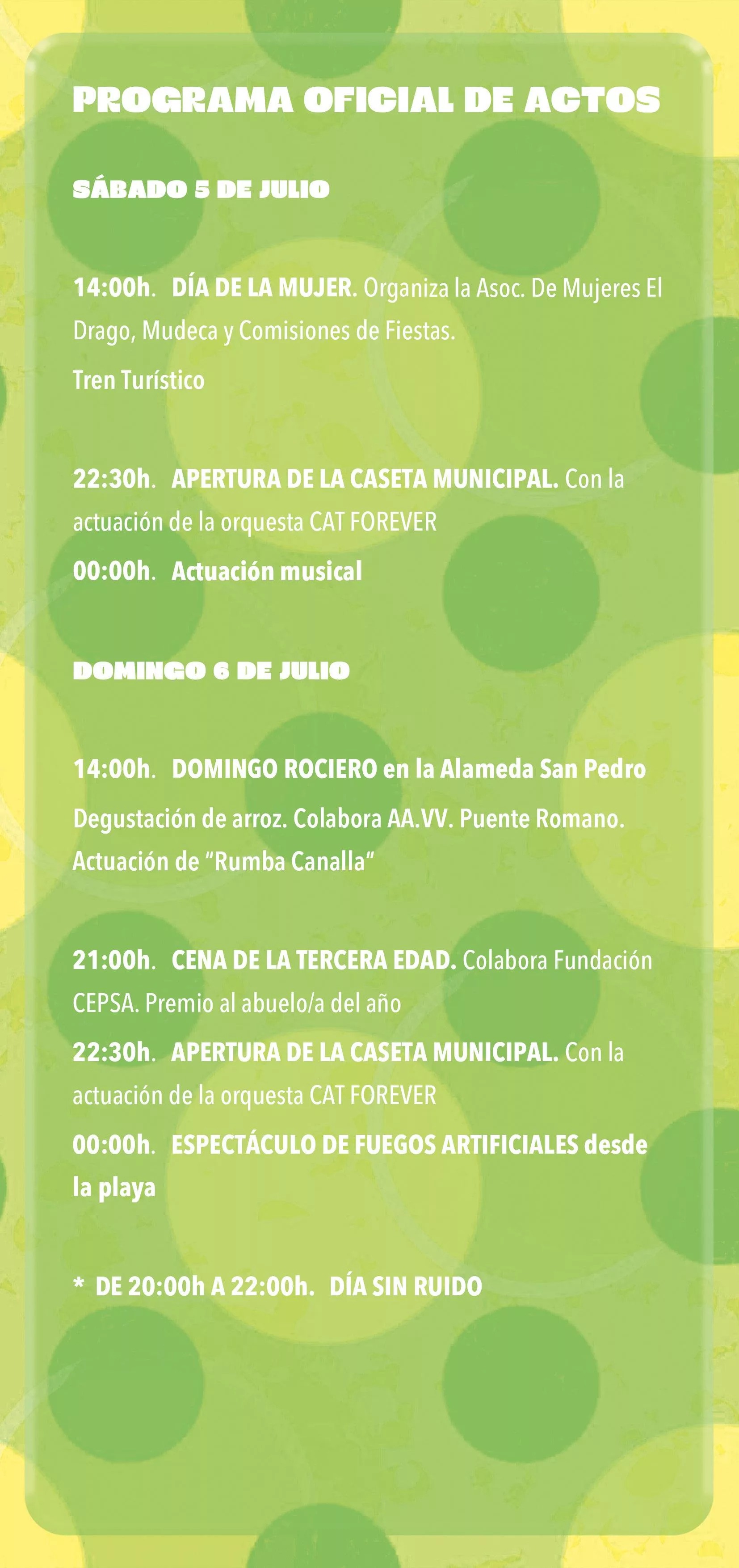 El sábado 5 de julio, la Asociación de Mujeres El Drago, Mudeca y las Comisiones de Fiestas de ambas barriadas organizan a las 14:00 horas el Día de la Mujer, con un tren turístico. Ya por la noche la apertura de la Caseta Municipal con la Orquesta Cat Forever, y actuación musical a partir de las 00.00 horas.