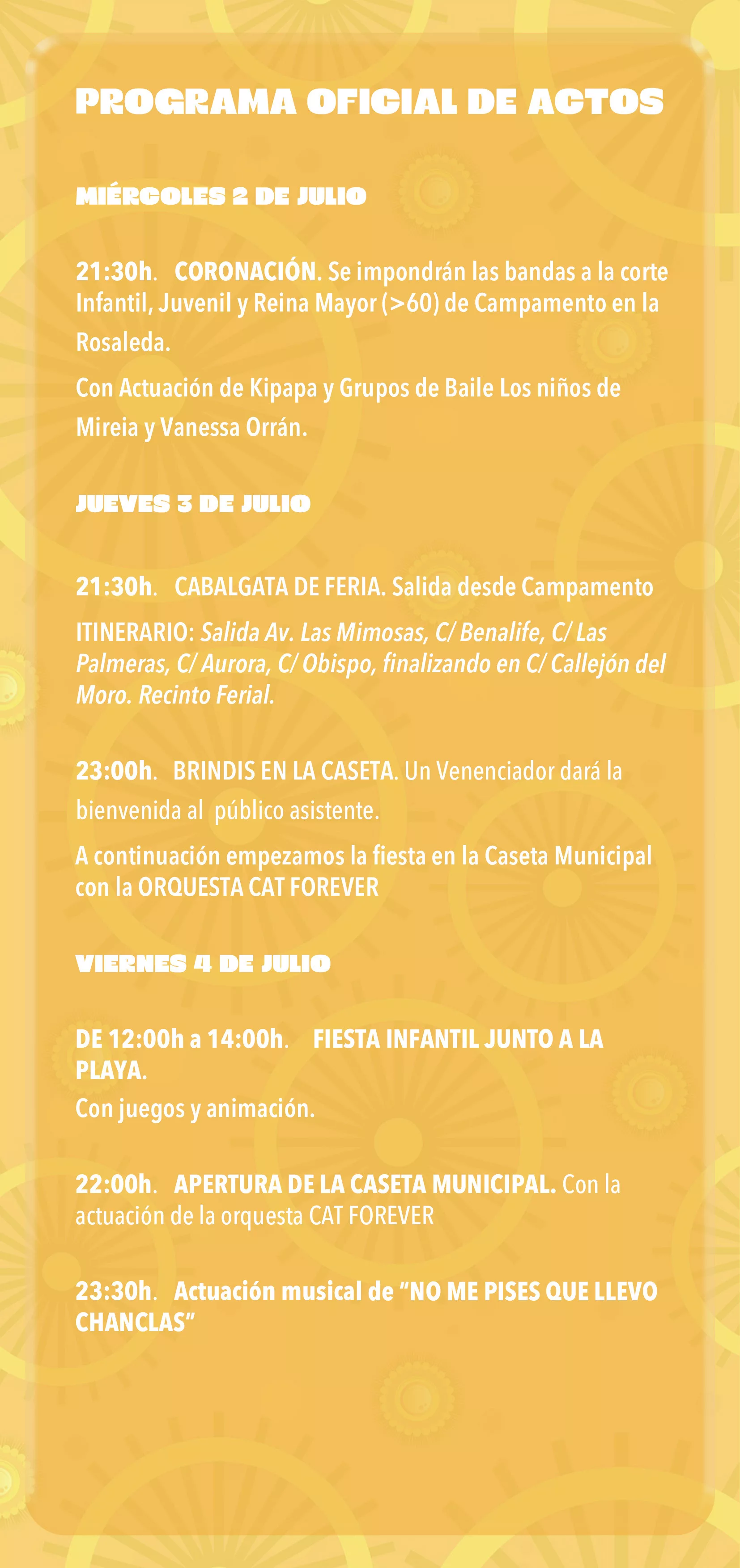 La Cabalgata de Campamento saldrá desde la avenida Las Mimosas, para discurrir por las calles Benalife, Las Palmeras, Aurora, Obispo, finalizando en Callejón del Moro, junto al Recinto Ferial.