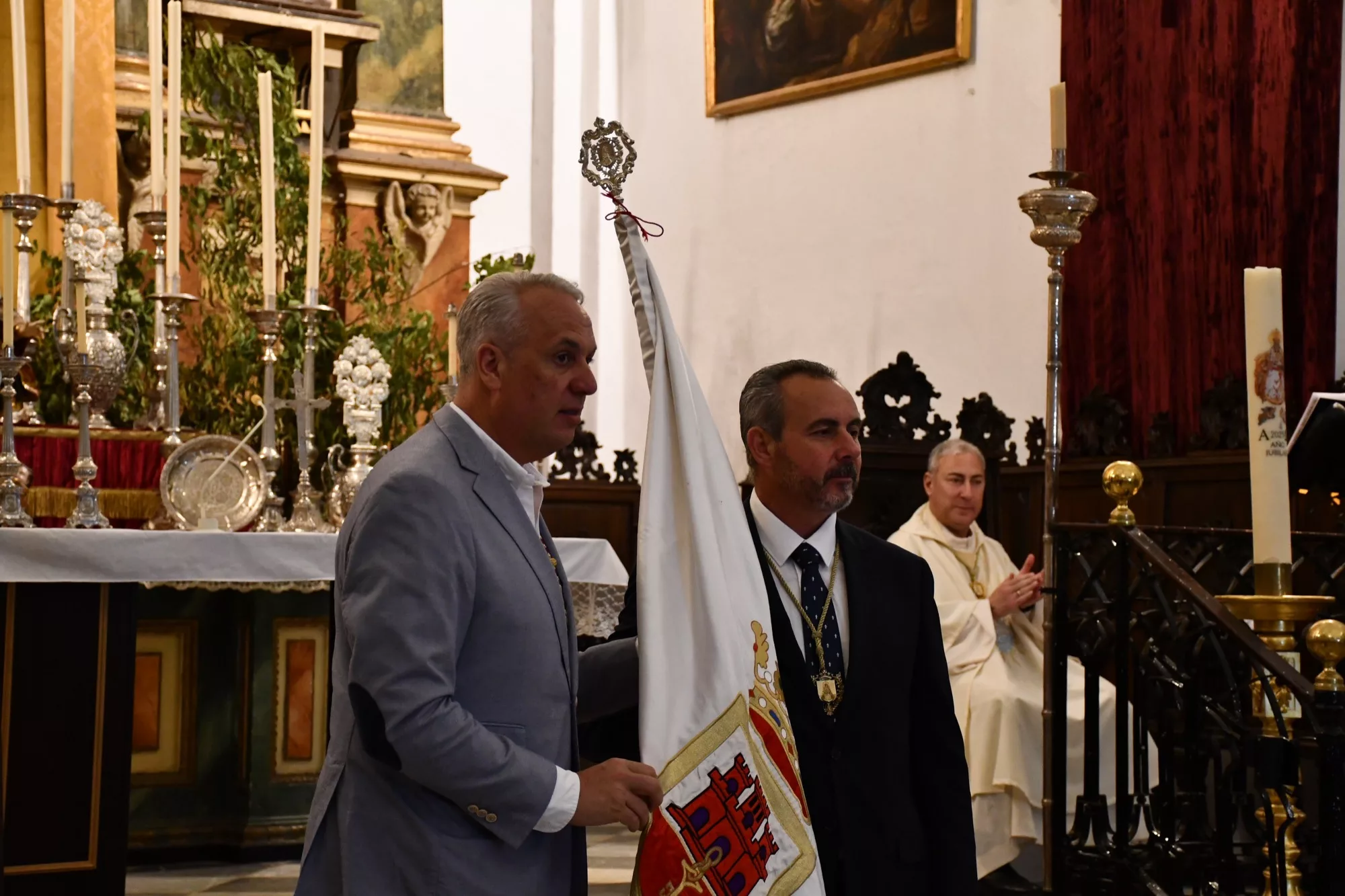 El acalde de San Roque, Juan Carlos Ruiz Boix, hizo entrega al hermano mayor de la bandera de la ciudad de San Roque que será aportada por la hermandad en su camino a la aldea del rocío.