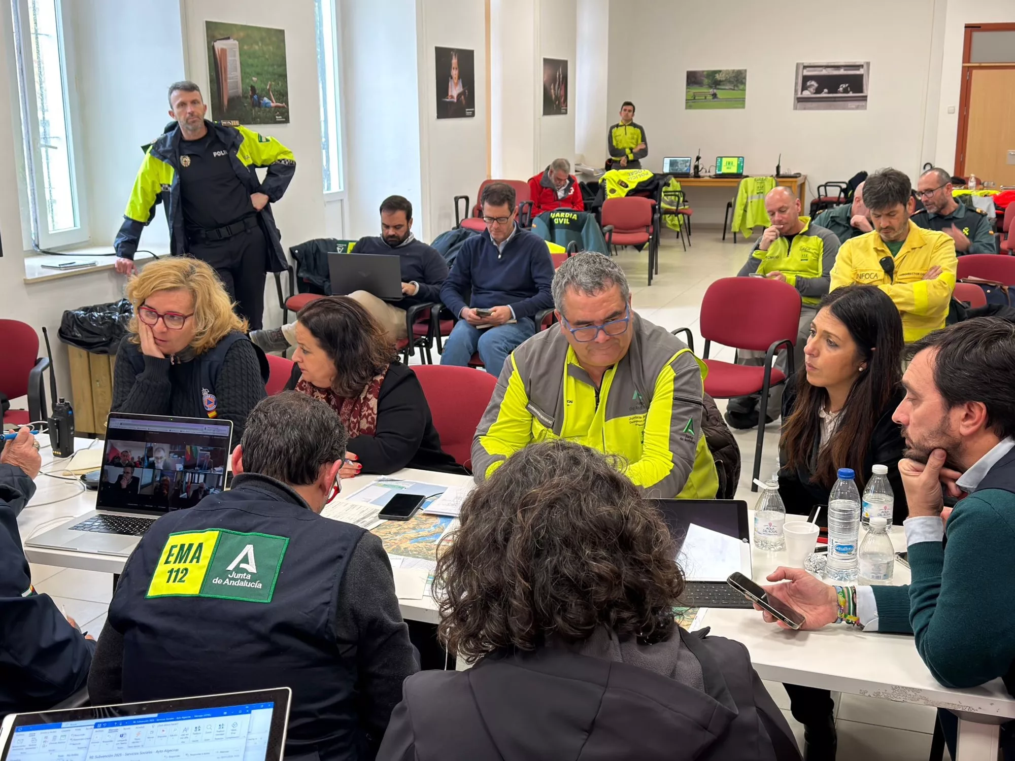 La alcaldesa accidental de San Roque, María del Mar Collado, junto al delegado de Seguridad, David Ramos, la delegada de Obras y Servicios, Belén Jiménez, y otros ediles, han estado presentes en todo momento en el centro de mando avanzado instalado por la Junta de Andalucía, y en el que se están adoptando diversas decisiones para afrontar está alerta.