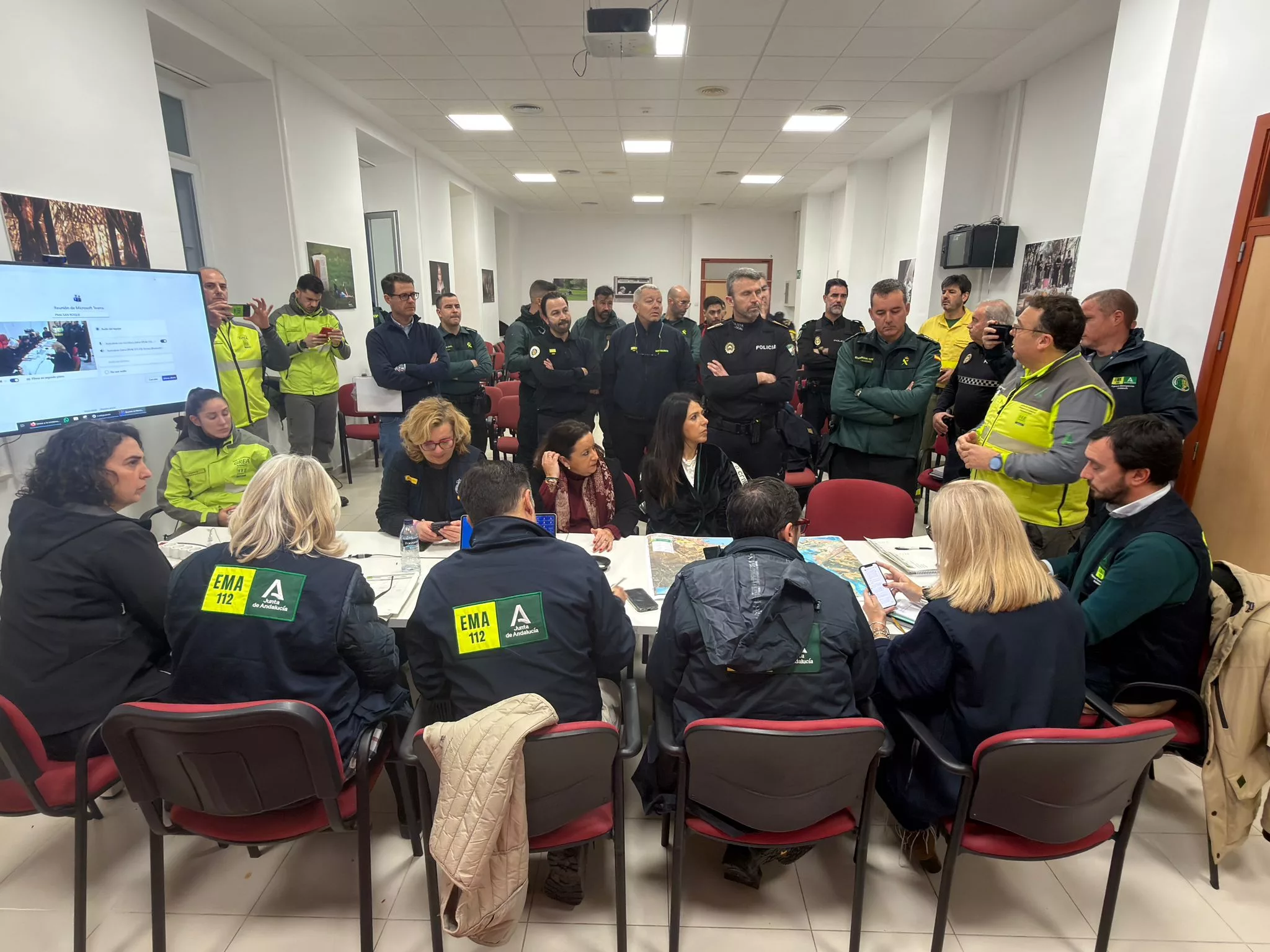 La alcaldesa accidental de San Roque, María del Mar Collado, junto al delegado de Seguridad, David Ramos, y otros ediles, han estado presentes en todo momento en el centro de mando avanzado instalado por la Junta de Andalucía, y en el que se están adoptando diversas decisiones para afrontar está alerta.