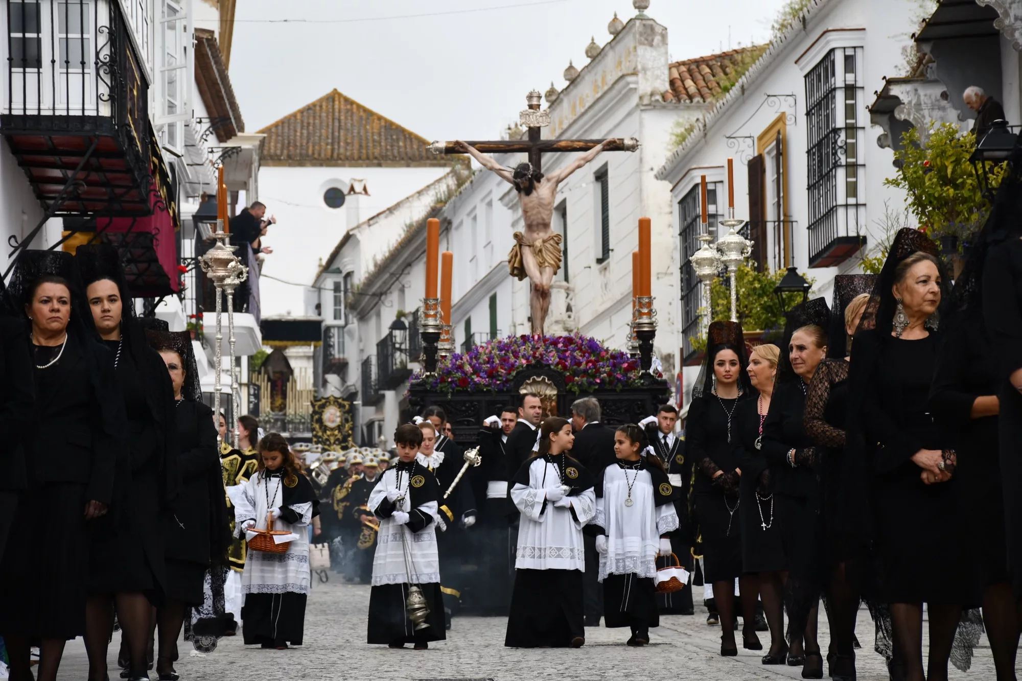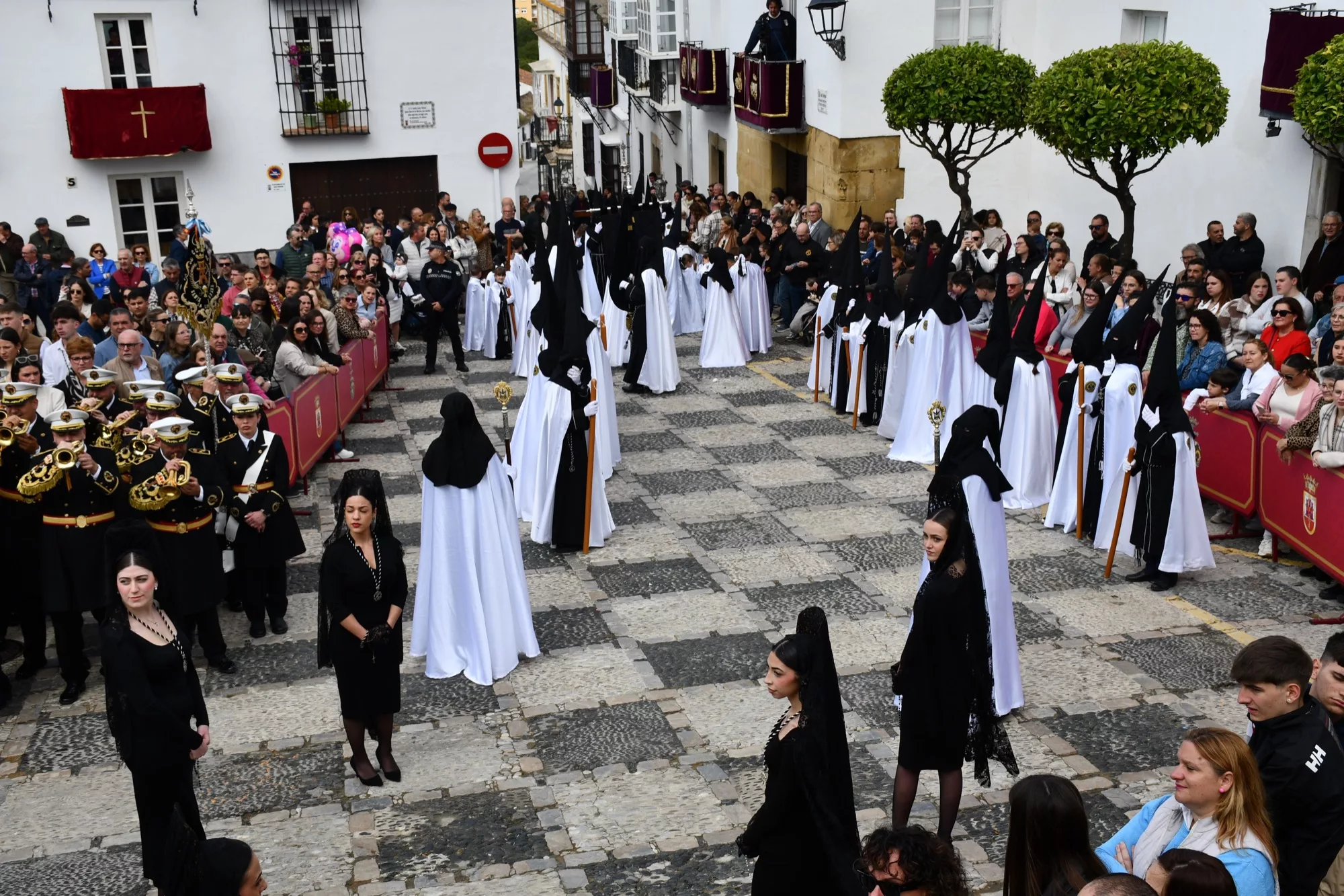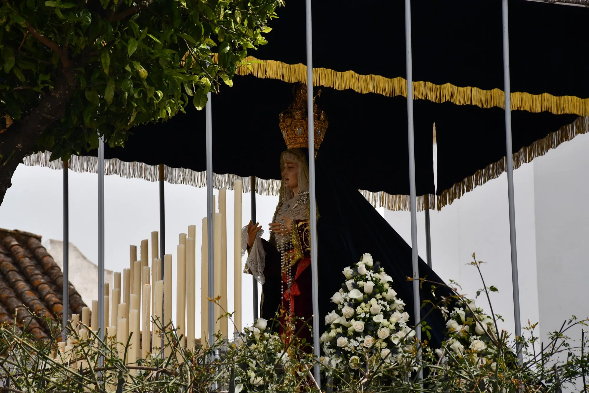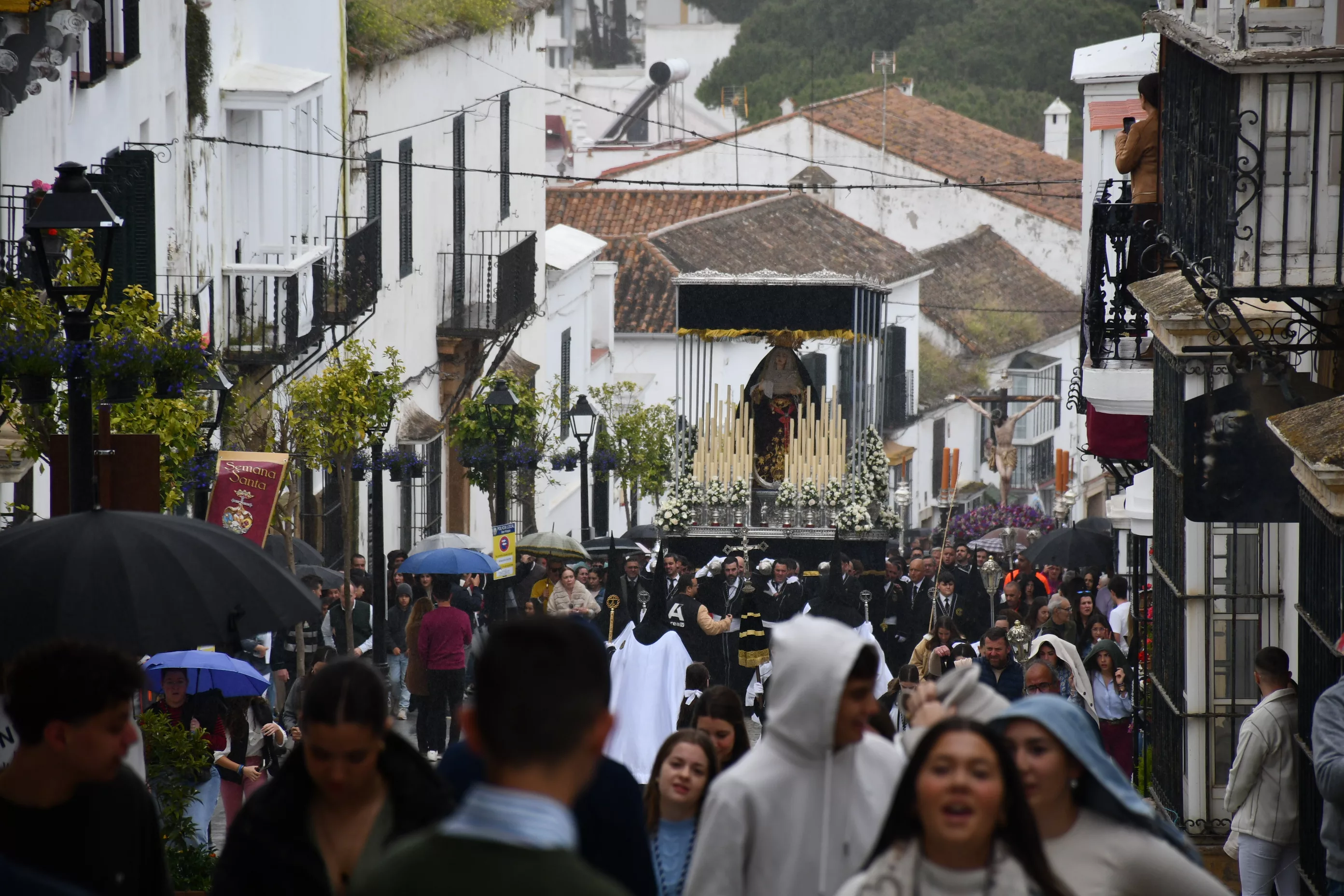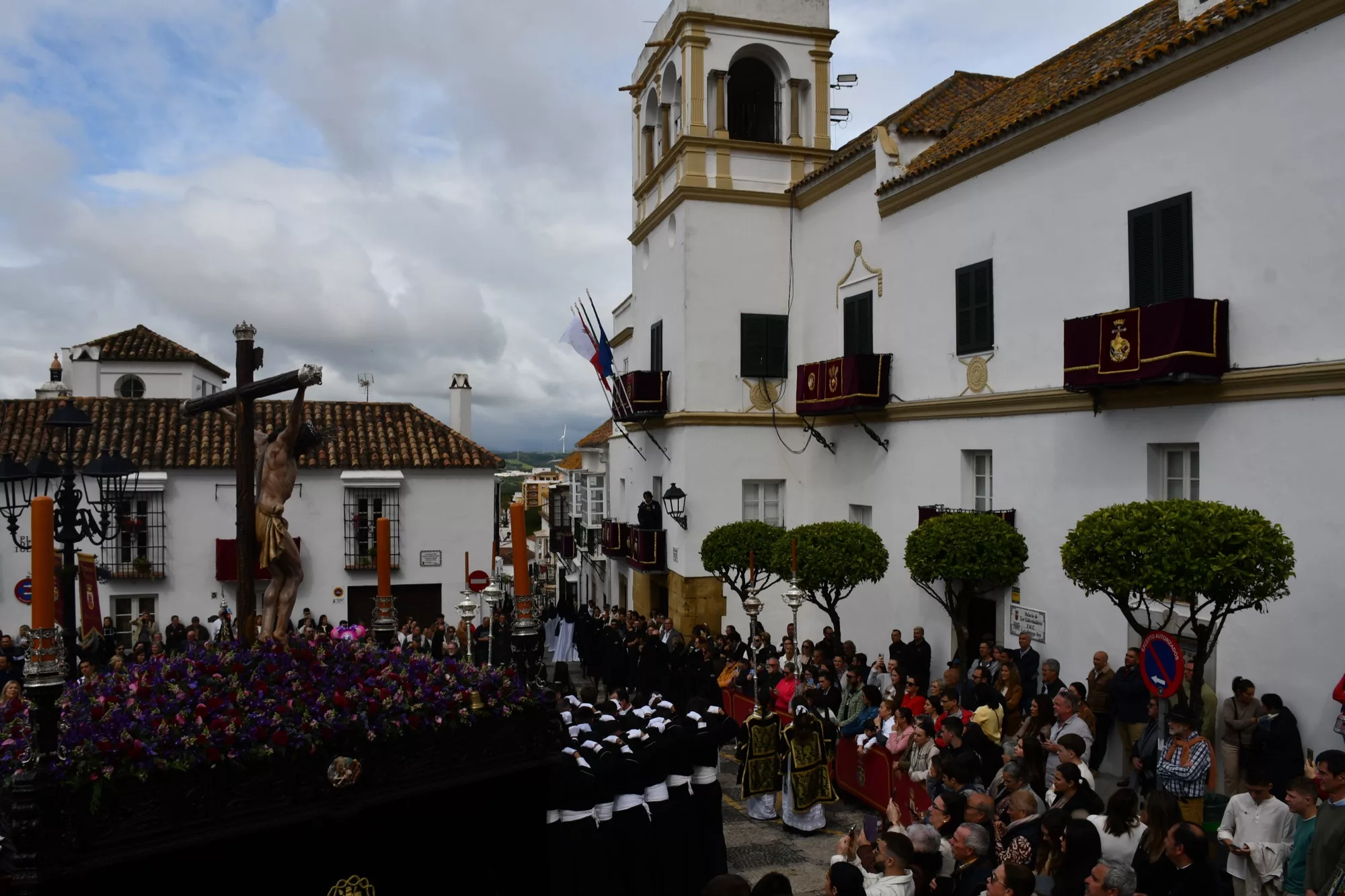 La procesión de la Venerable Hermandad de Penitencia del Santísimo Cristo de la Buena Muerte y María Santísima de la Amargura, en la mañana del Jueves Santo en San Roque, se ha visto interrumpida por la intensa lluvia que ha comenzado a caer poco más de una hora después de la salida, que se ha realizado a las 11 de la mañana.