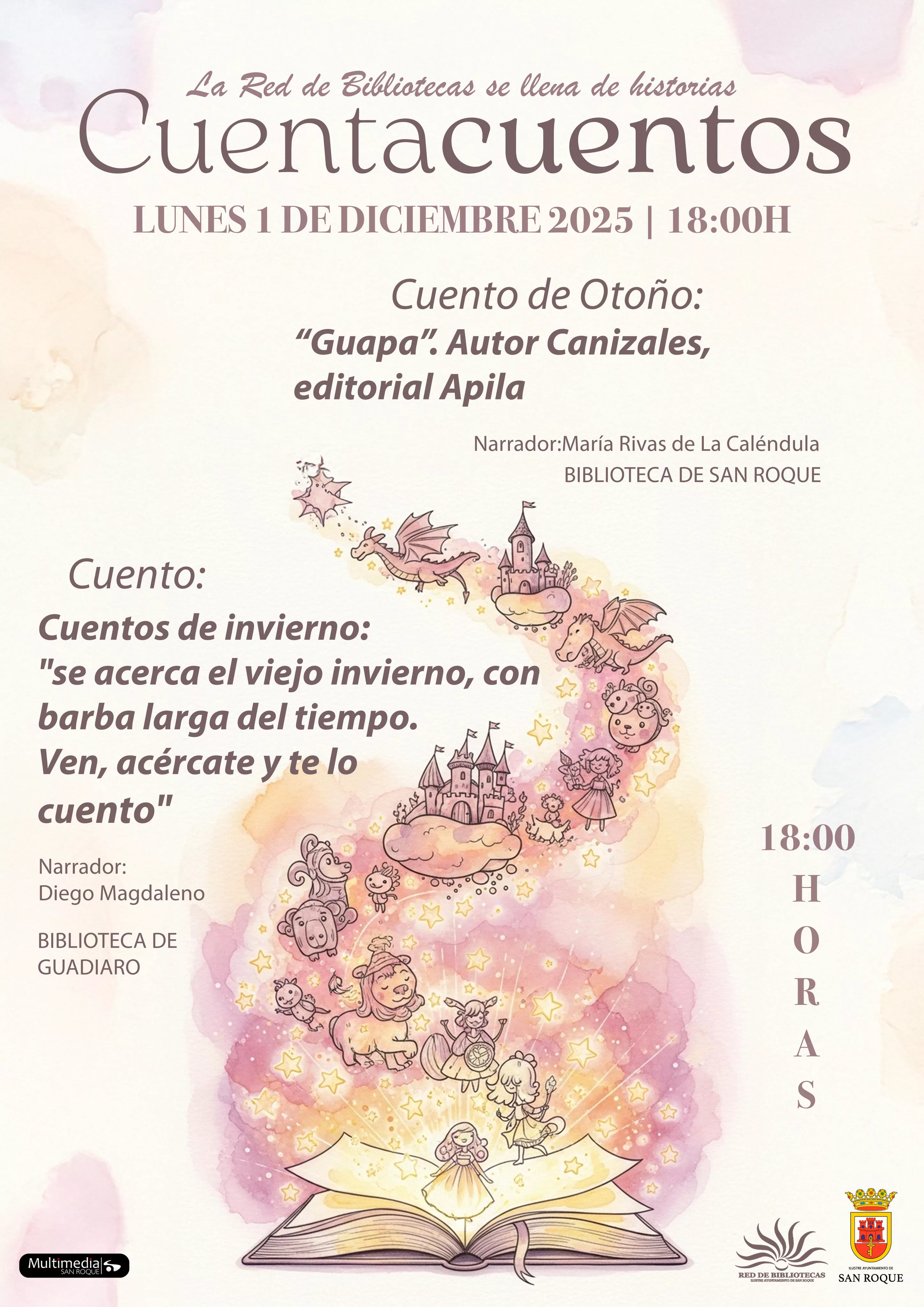 La Red de Bibliotecas de San Roque vuelve a apostar por la animación a la lectura con una nueva sesión del programa Cuentacuentos, que se celebrará el lunes 1 de diciembre de 2025 a las 18:00 horas. La actividad, dirigida a público infantil y familiar, tendrá lugar de forma simultánea en la Biblioteca de San Roque y en la Biblioteca de Guadiaro.