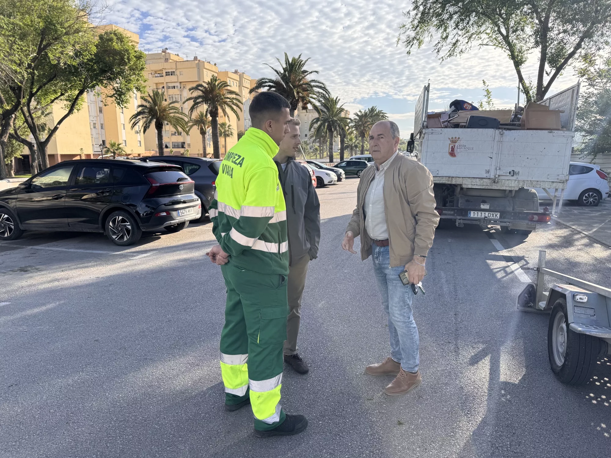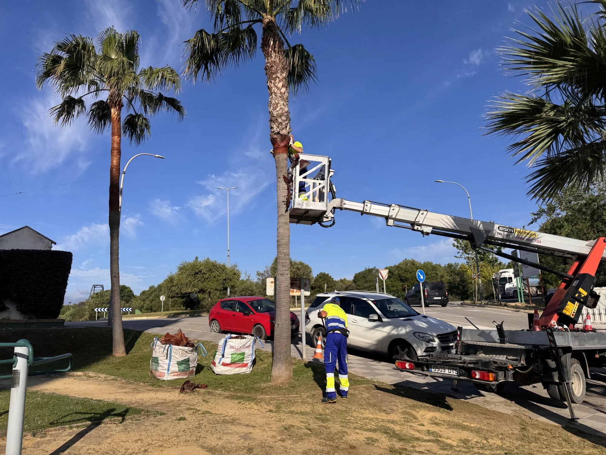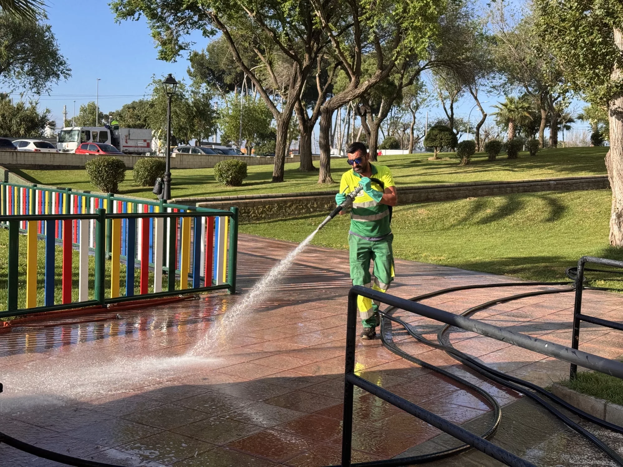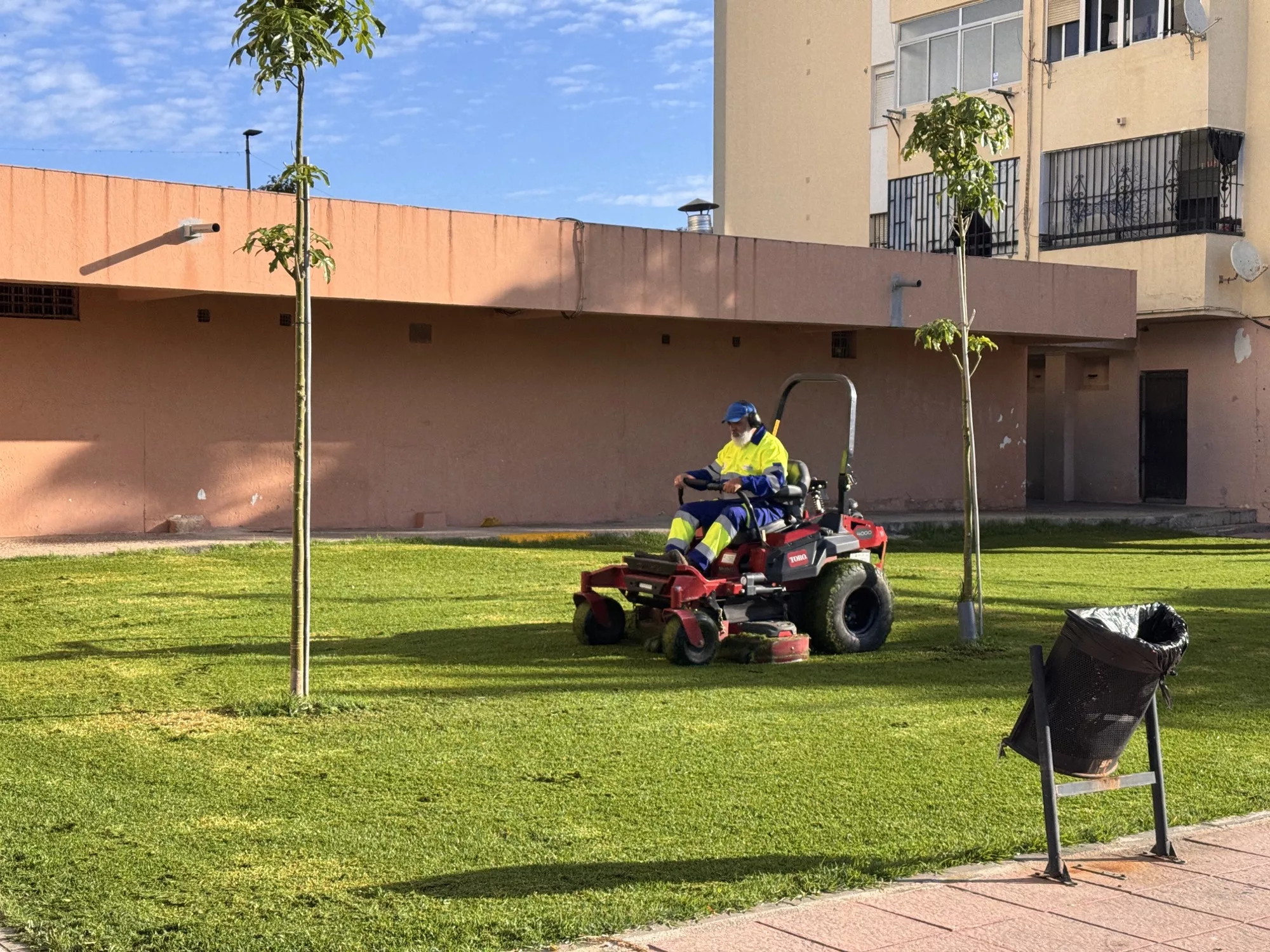 Explicó Juan Serván que para estas limpiezas especiales se utiliza agua no potable para arrancar suciedad del pavimento, mientras que las barredoras mecánicas se ocupan de las calzadas. Además, el personal de Jardinería lleva a cabo trabajos como el corte de césped y, en esta ocasión en Miraflores, la poda de las palmeras. También se hacen desbroces y se recogen muebles y enseres, entre otras tareas.