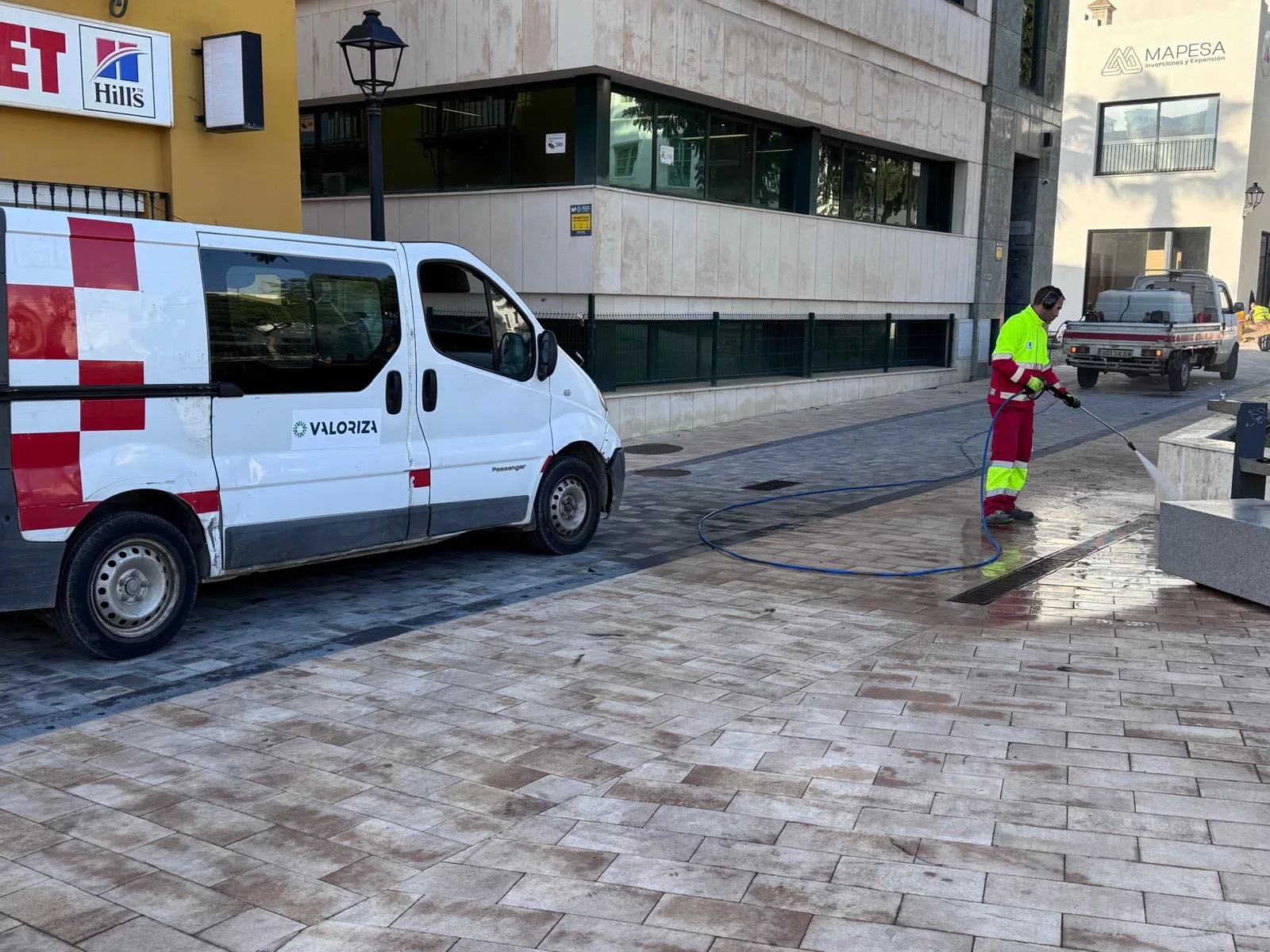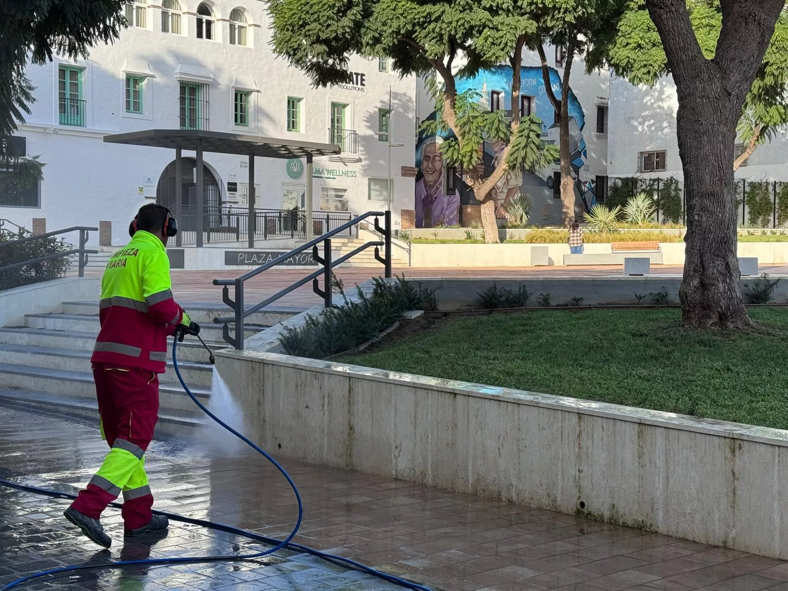La Delegación de Limpieza Viaria coordinada por el teniente de alcalde Juan Serván, a través de la empresa Valoriza, ha realizado durante la mañana del miércoles una limpieza integral por las calle Sierra Bermeja y Altamira, por el entorno de la iglesia, y la Plaza Mayor, entre otras vías y plazoletas del área más comercial de Pueblo Nuevo.