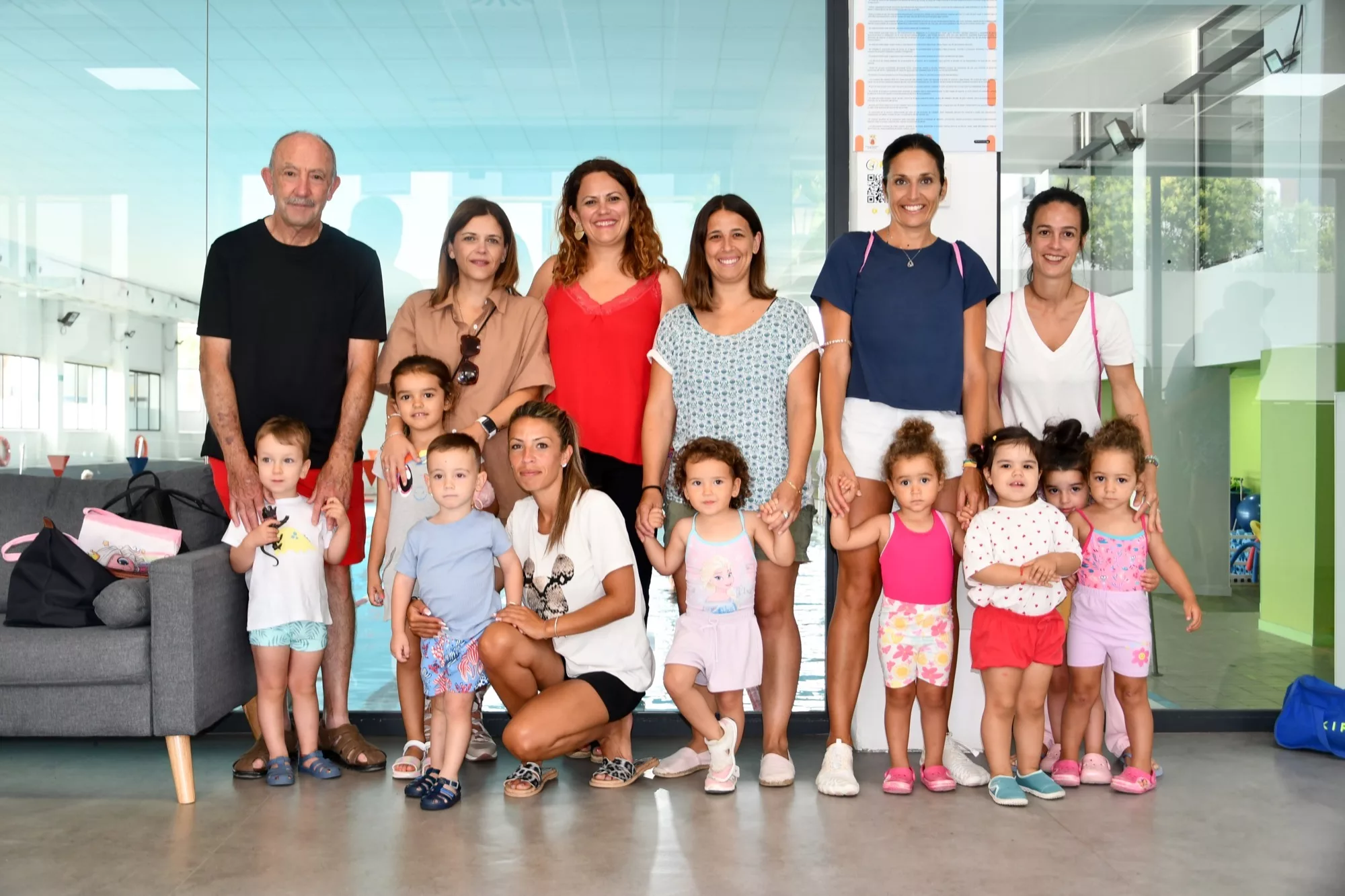 Un grupo de pequeños de la Escuela Infantil Nelson Mandela, junto a algunos de sus familiares, ha disfrutado este miércoles de una introducción a la natación de la mano de la empresa adjudicataria de la Piscina Municipal, Deportes AJ17.
