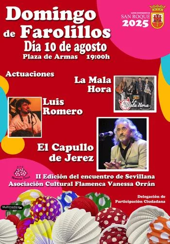 La Delegación de Participación Ciudadana, que dirige la concejal Rocío Fernández, organiza el Domingo de Farolillos, una actividad que se celebrará mañana en la Plaza de Armas a partir de las 19.00 horas. Capullo de Jerez encabeza el cartel de una iniciativa que el año pasado, en su primera edición, tuvo un gran éxito de asistencia.