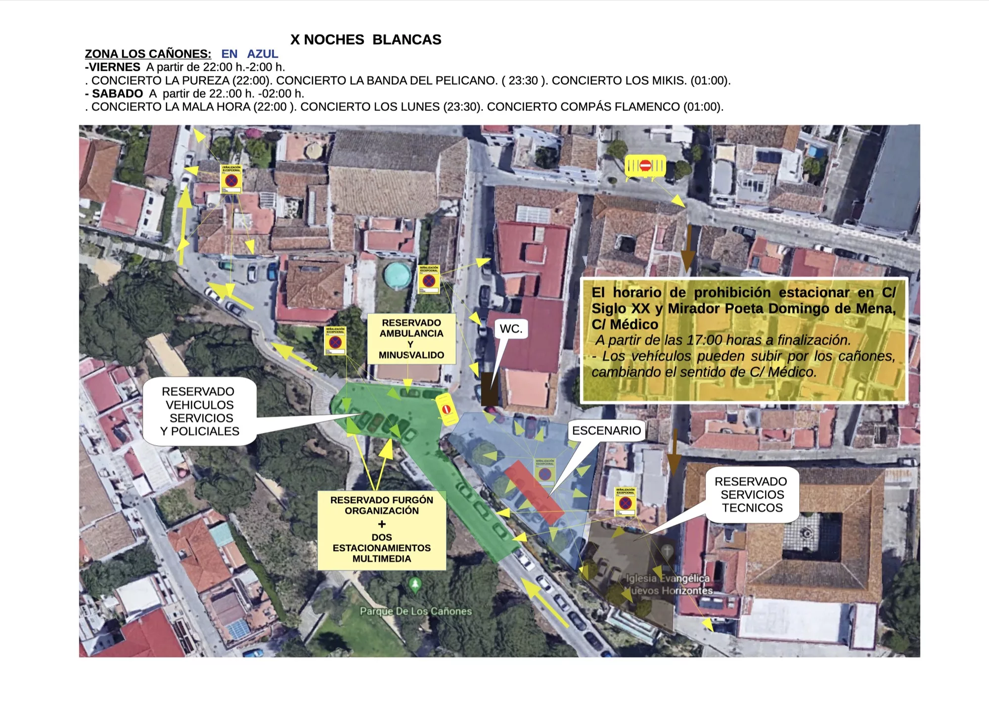 Como entre las 22.00 y las 2.00 horas de ambos días se desarrollarán conciertos en la zona de Los Cañones, a partir de las 17.00 horas y hasta la finalización de los recitales se prohibirá estacionar en las calles Siglo XX, Médico Augusto Alcaide y Mirador Poeta Domingo de Mena. Como se cortará el tráfico en la calle Coronel Cadalso a la altura de la Plaza de Armas y en la calle Siglo XX, los vehículos podrán subir por el parque de Los Cañones y luego cambiar de sentido por Médico Augusto Alcaide.