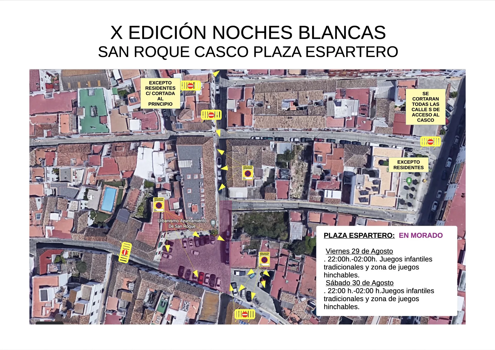 La Delegación de Seguridad Ciudadana, que dirige el teniente de alcalde David Ramos, ha establecido una serie de medidas especiales de tráfico para el viernes y el sábado con motivo de la celebración de la X Noche Blanca. Esta actividad, que organiza la Delegación de Cultura, que encabeza la también teniente de alcalde Ana Ruiz, incluye numerosos actos en distintos puntos del Casco Histórico sanroqueño.