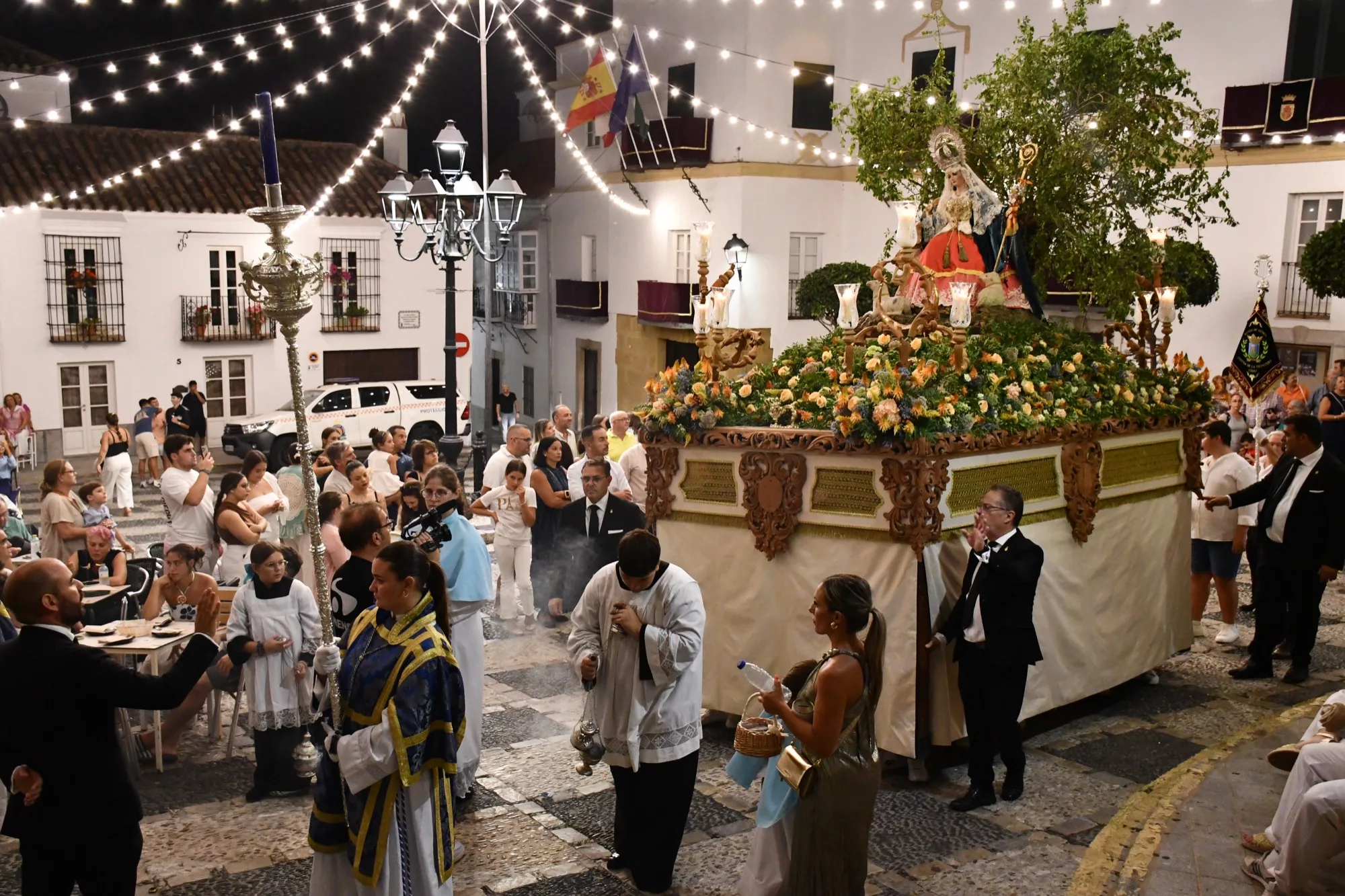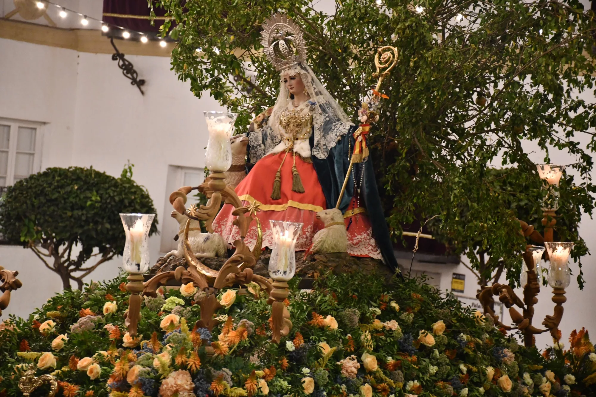 Un buen número de fieles ha participado en la noche de este sábado en la procesión de la Divina Pastora, Madre del Buen Pastor, que ha recorrido las calles del Casco Histórico sanroqueño partiendo de la Parroquia de Santa María La Coronada.