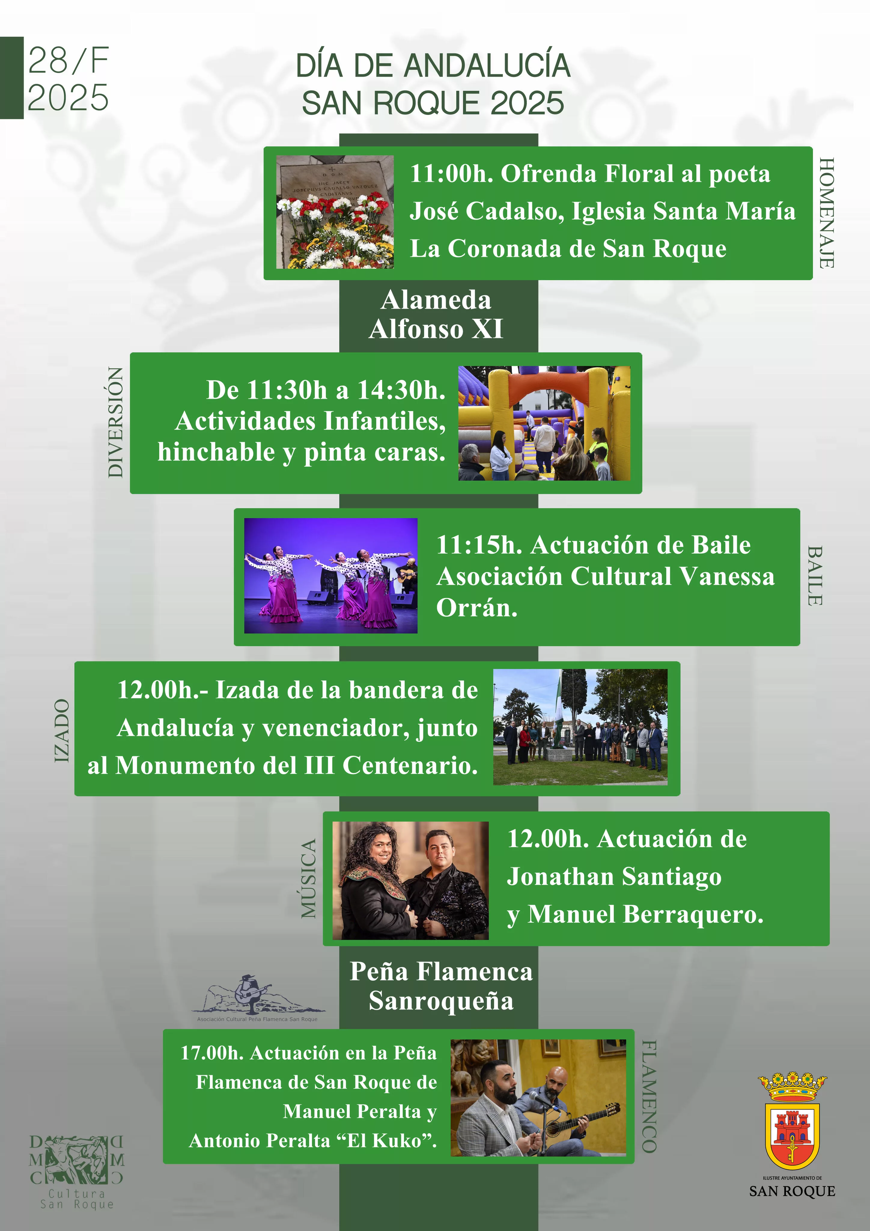 En cuanto a la programación del Día de Andalucía por zonas del municipio, en San Roque Ciudad el primer acto será la tradicional ofrenda floral en la tumba de José Cadalso, en el interior de la Iglesia de Santa María La Coronada a las 11.00 horas.