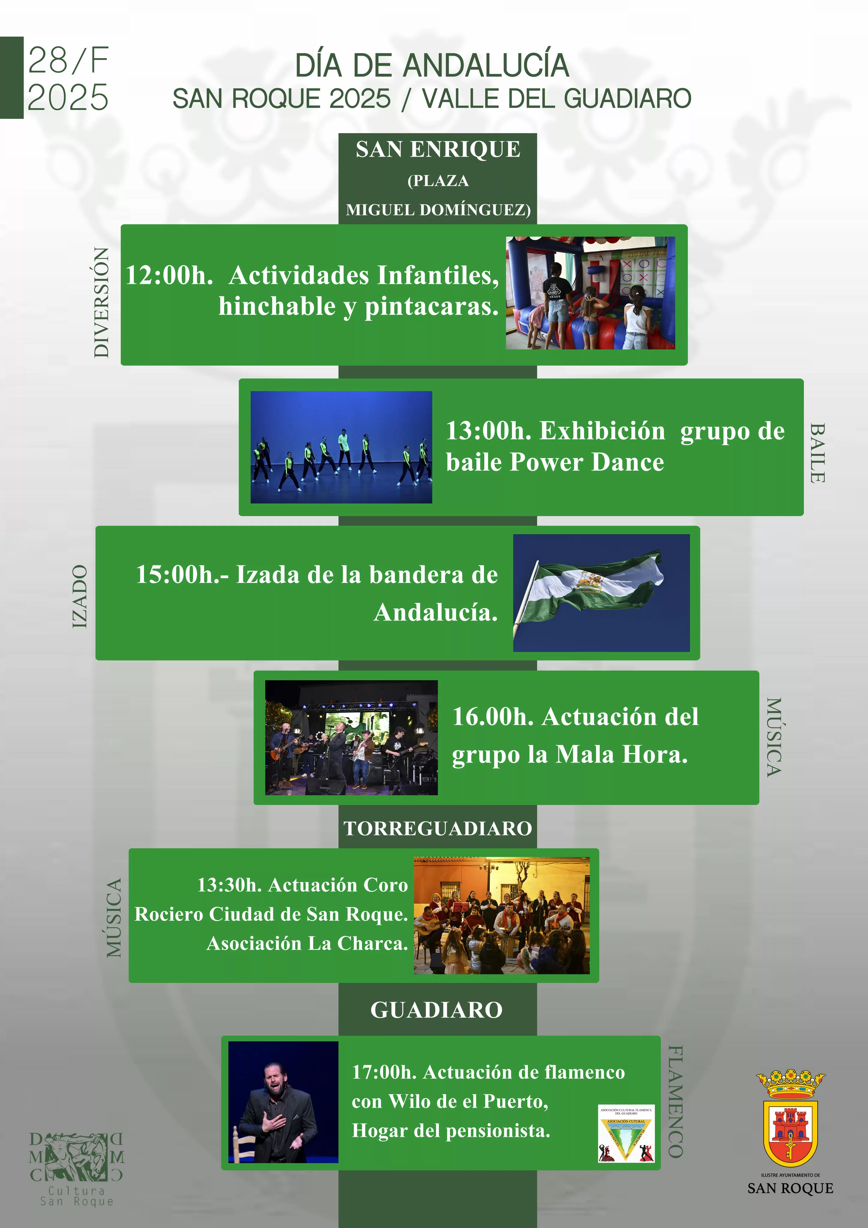 En cuanto al Valle del Guadiaro, las actividades programadas para San Enrique tendrán lugar en la Plaza Miguel Domínguez, situada frente al Edificio Multiusos. A las 12.00 habrá actividades infantiles, hinchable y pintacaras, y a las 13.00 horas se podrá disfrutar de una exhibición de baile a cargo de Power Dance. A las 15.00 horas se procederá a la izada de la bandera de Andalucía, para a las 16.00 comenzar la actuación del grupo La Mala Hora.