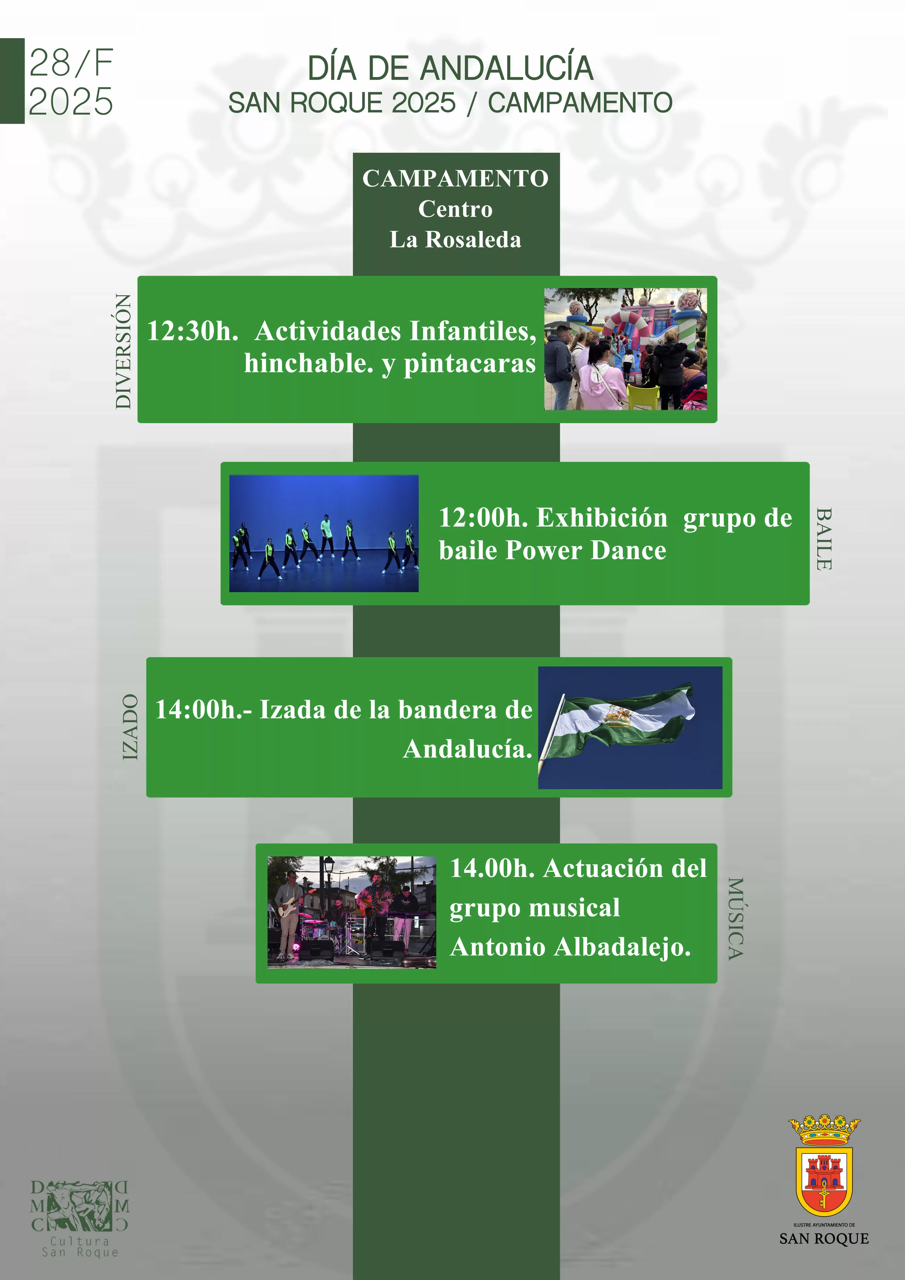 En Campamento los actos del 28F se celebrarán en el Edificio La Rosaleda. A las 12.00 horas actuará el grupo de baile Power Dance, y a 12.30 horas se iniciarán las actividades infantiles, hinchables y pintacaras. A las 14.00 horas se procederá a la izada de la bandera blanca y verde y actuará el grupo musical de Antonio Albadalejo.