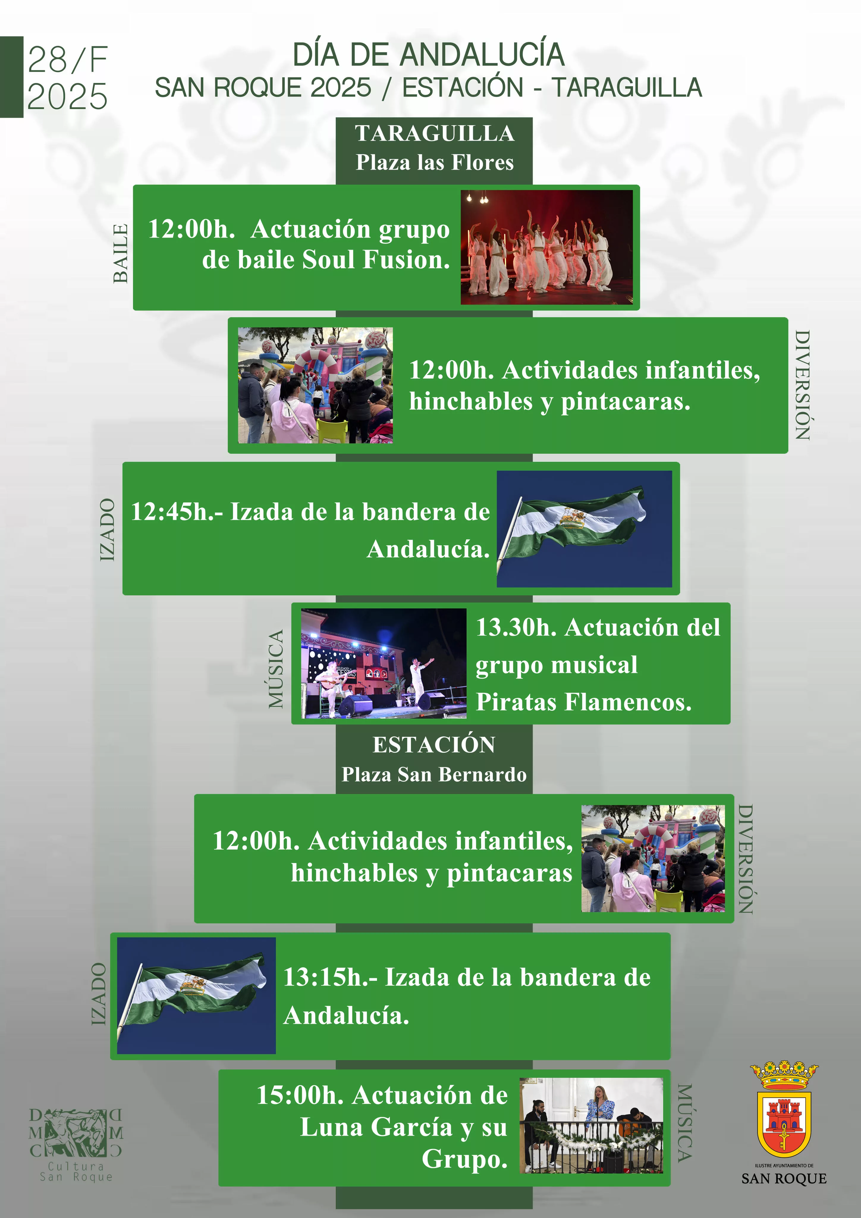 En cuanto a la Estación de San Roque, a las 12.00 horas habrá actividades infantiles, hinchables y pintacaras en la Plaza de San Bernardo, mientras que a las 13.15 se procederá a la izada de la bandera andaluza. A las 15.00 horas actuará Luna García y su grupo.