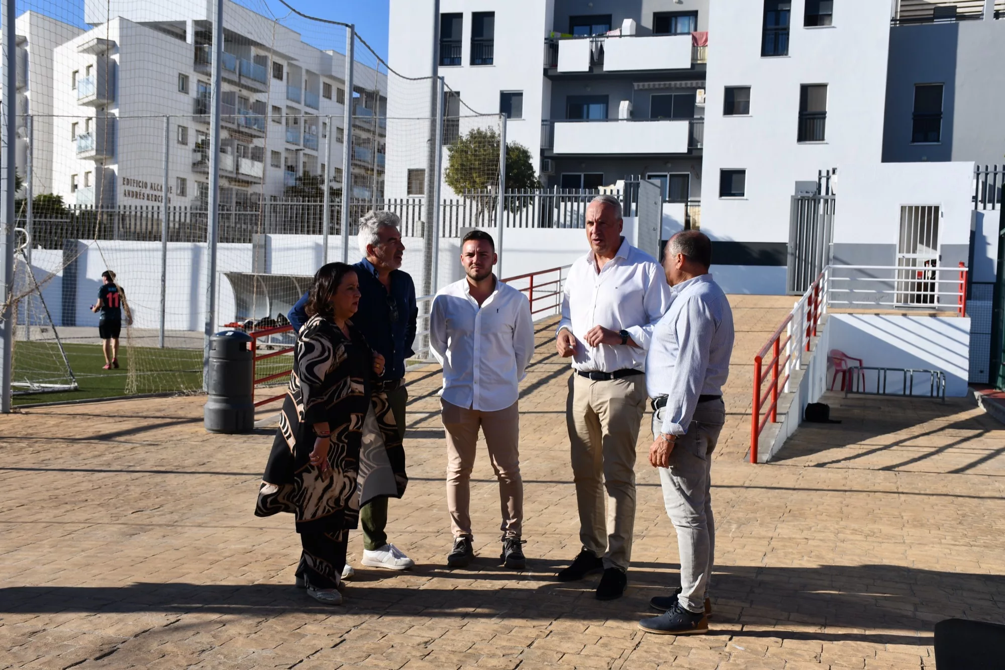 El alcalde de San Roque, Juan Carlos Ruiz Boix, junto al delegado de deportes, Fernando Vega, otros miembros de la Corporación y técnicos municipales visitaron las instalaciones. El primer edil espera que “esta inversión en las tres pistas de pádel, de 20.000 euros, no sea solo la renovación de un firme de hace 15 años, sino que este nuevo material combine tanto conservación como desgaste por el gran uso de los jugadores”.