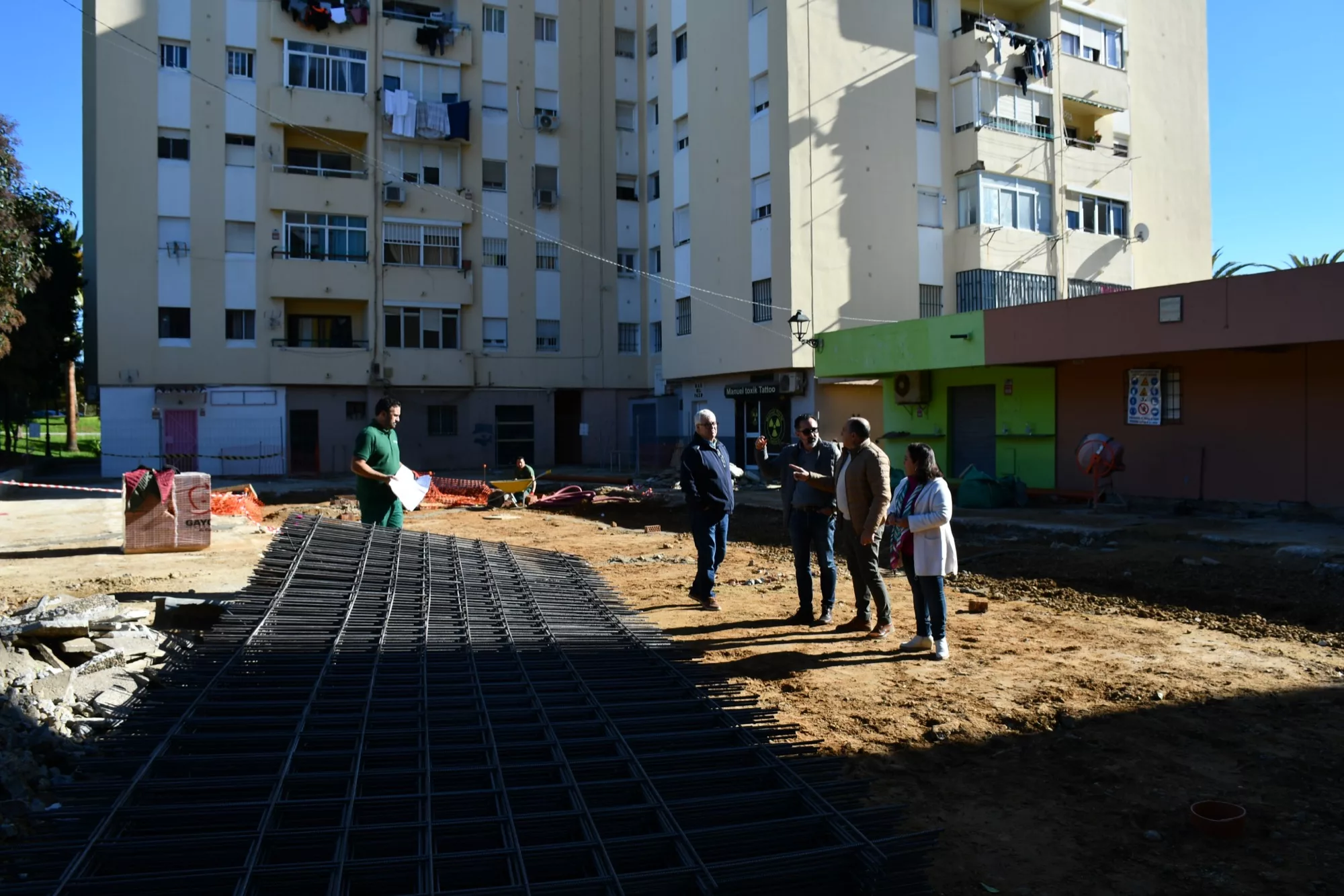 La teniente de alcalde delegada de Urbanismo, María del Mar Collado, junto al delegado responsable de la zona de Estación, Taraguilla y Miraflores, Juan Serván, han visitado las obras que se están acometiendo en la plaza de Miraflores, donde se encuentran los locales de los negocios de la barriada.