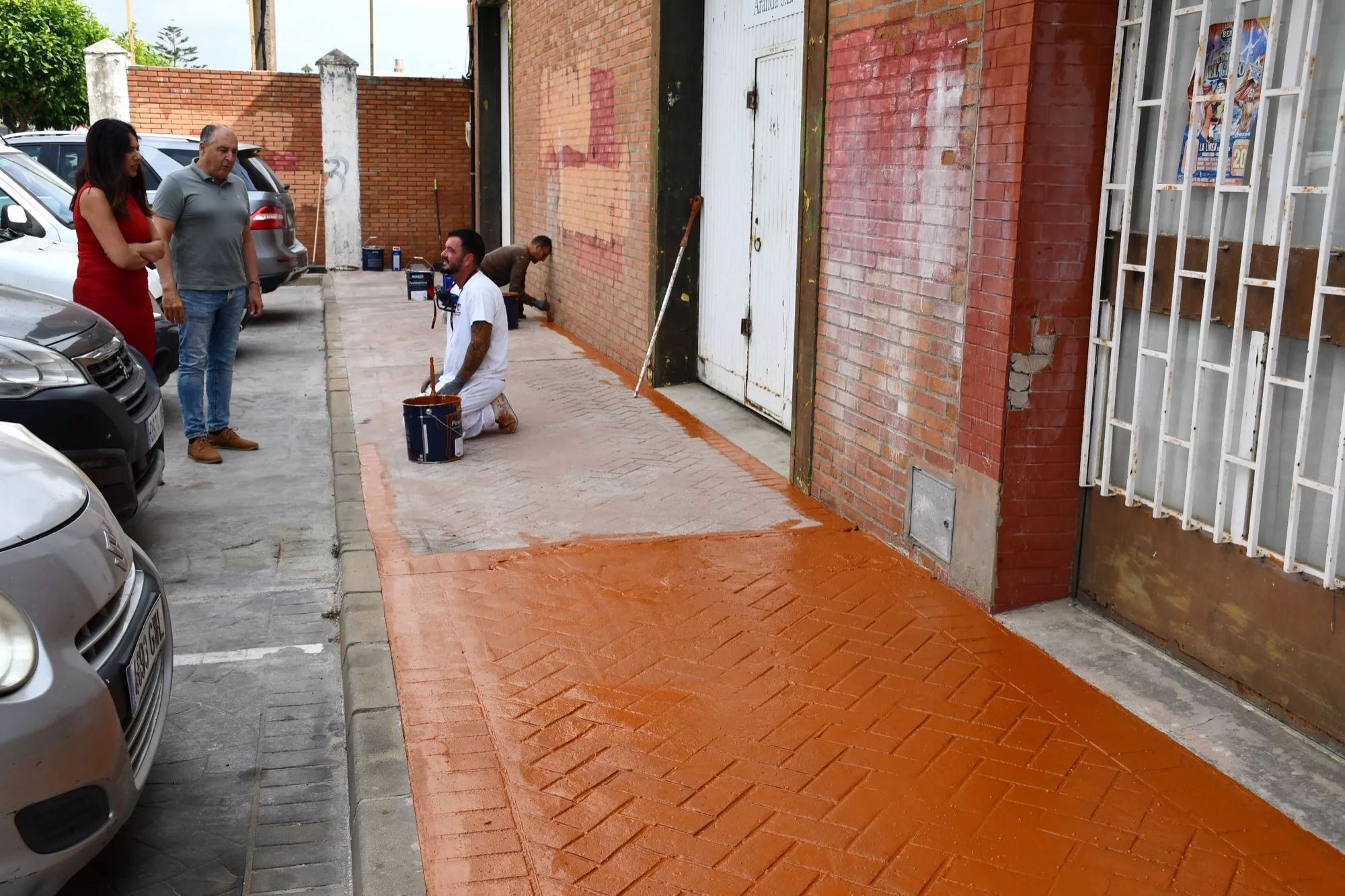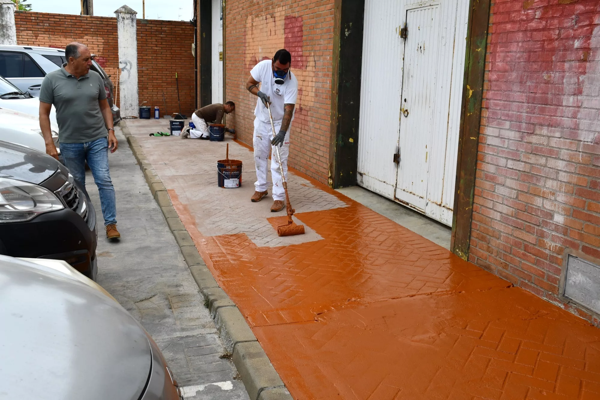 La Delegación de Obras y Servicios está aplicando una capa de clorocaucho sobre el pavimento de hormigón impreso de la Avenida de Guadarranque, lo que supone la rehabilitación de aproximadamente un kilómetro de una de las vías más transitadas del municipio.