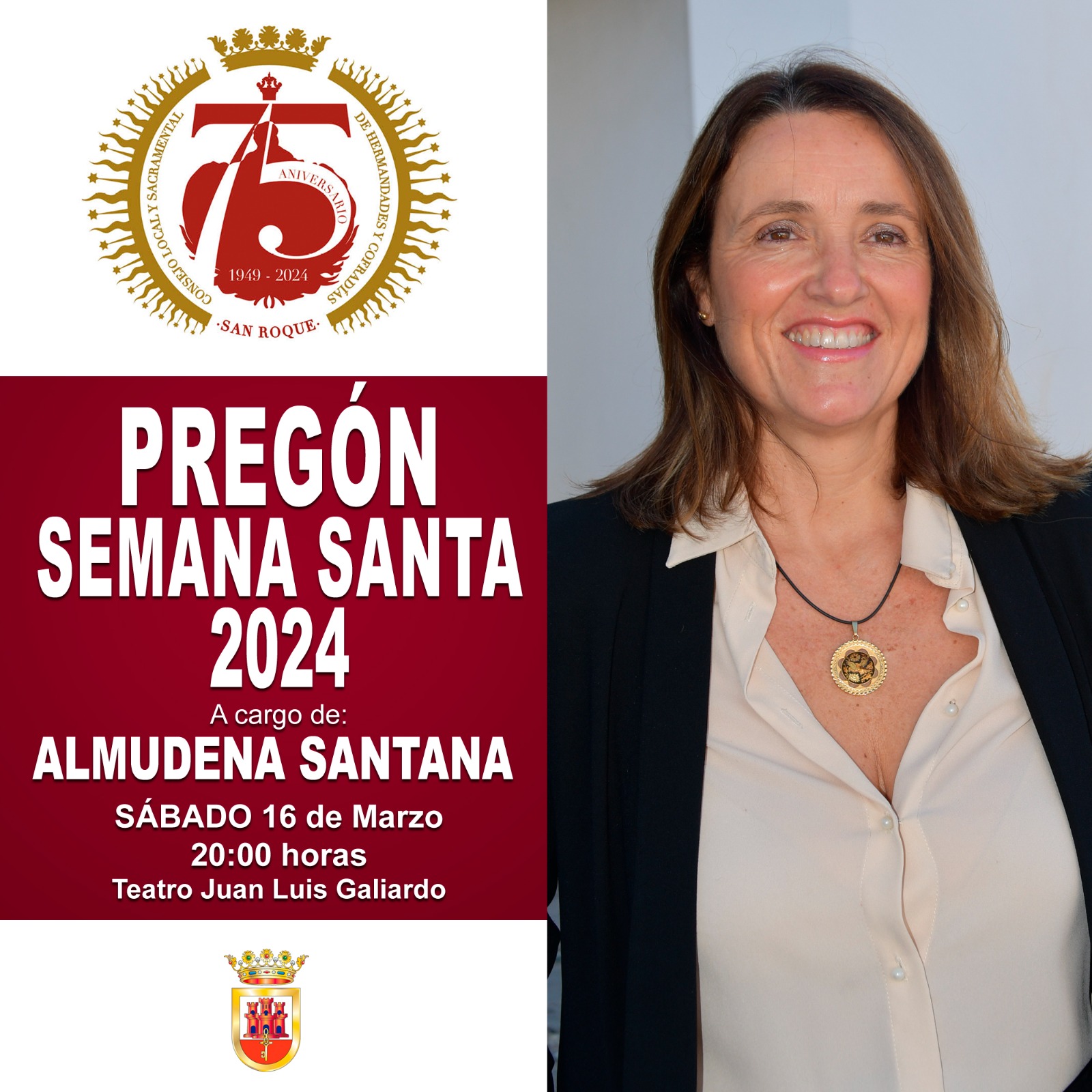 El Consejo Local de Hermandades y Cofradías de San Roque encargó en septiembre pasado a Almudena Santana Romero el Pregón de Semana Santa 2024, que este sábado 16 se podrá disfrutar en el Teatro Juan Luis Galiardo a partir de las 20.00 horas. Colabora el Ayuntamiento a través de las delegaciones de Tradiciones y Cultura, que dirigen respectivamente las tenientes de alcalde María del Mar Collado y Ana Ruiz.