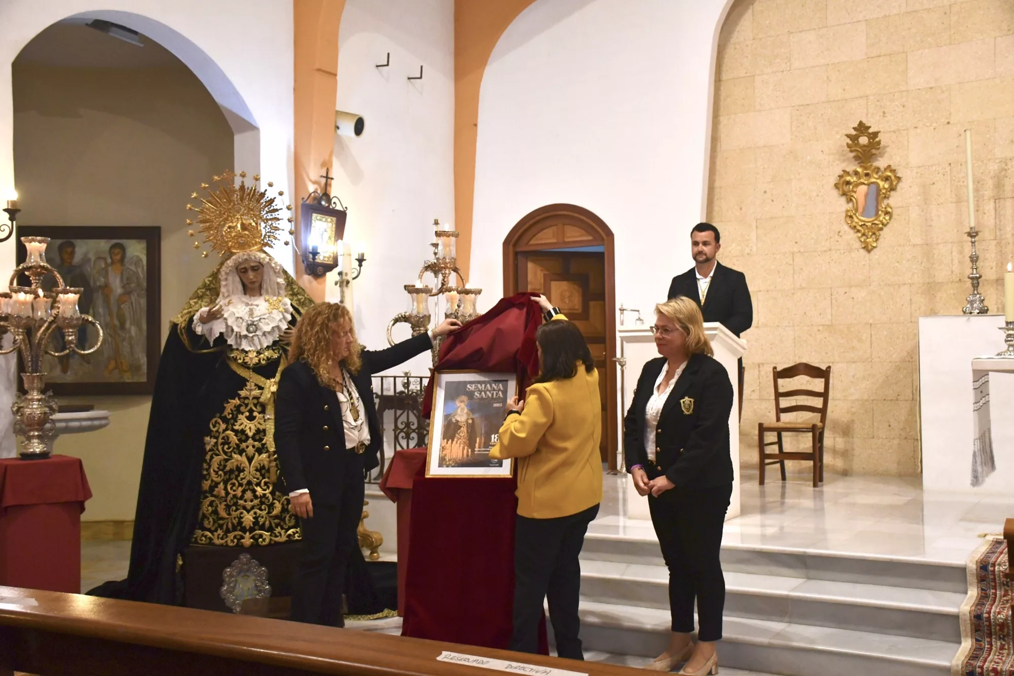 La Asociación Parroquial del Santo Entierro y Nuestra Señora de los Dolores de Guadiaro ha presentado este viernes el cartel oficial de la Semana Santa de la barriada durante la función principal del triduo de este colectivo religioso, que ha incluido también un besamanos a la Virgen.